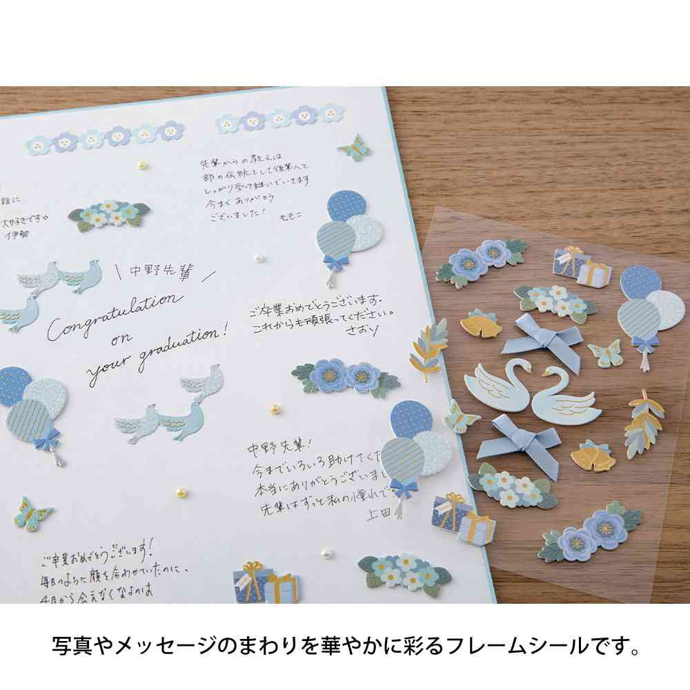 写真やメッセージのまわりを華やかなフレームのように彩るシールです。 パッケージの見本を参考にすれば、かんたんにオリジナリティあふれる色紙やカードが仕上がります。