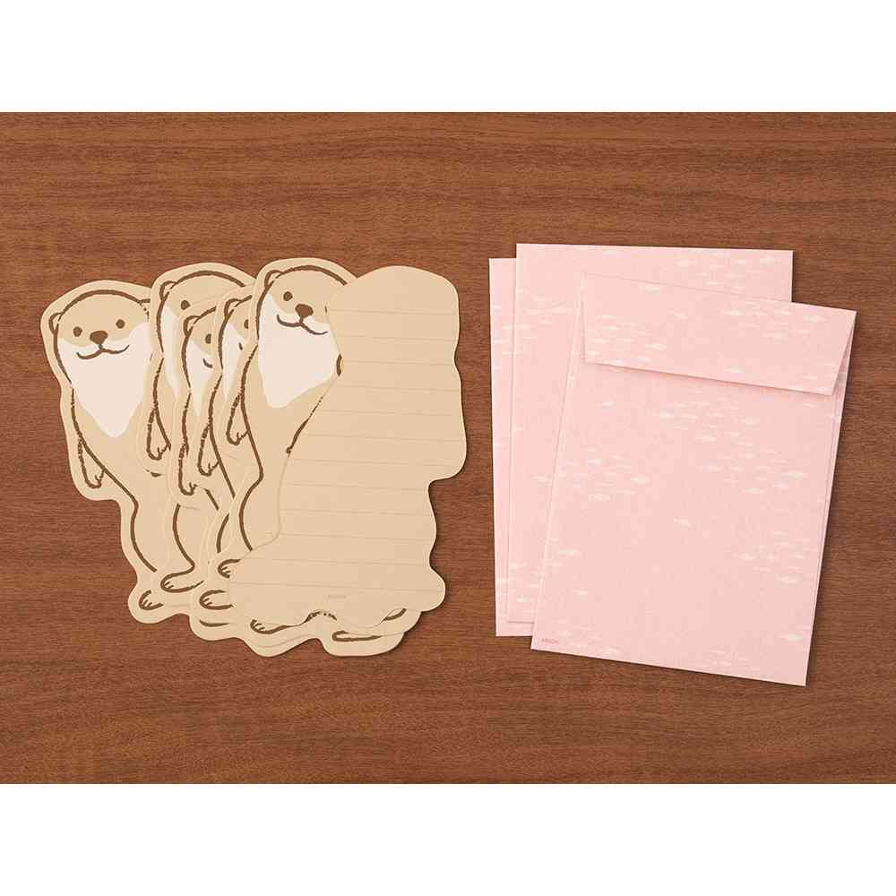 動物の形に抜かれた便箋と、動物に合わせた優しいパターンの封筒のレターセットです。 コツメカワウソを手描きタッチでデザインしました。 笑っているような口元がポイントです。