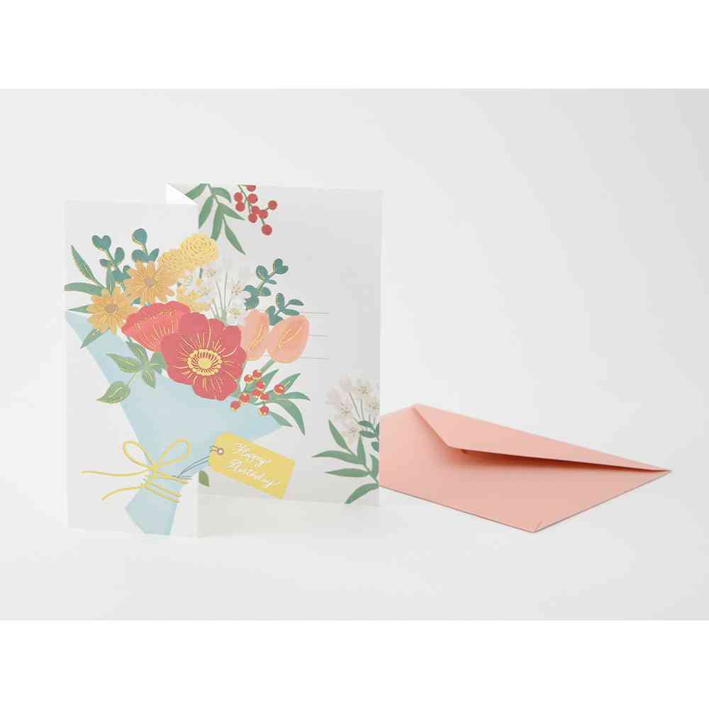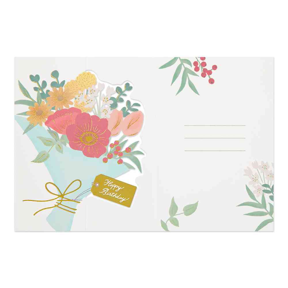 3つ折りになっており、少し開いて立てることができるグリーティングカードです。立てたときには、メッセージ部分が正面からは見えにくい構造。いただいた方に、部屋に飾って楽しんでいただける立体的なデザインです。 花束が飛び出すような華やかな絵柄で、老若男女に使いやすい定番のお祝いモチーフです。
