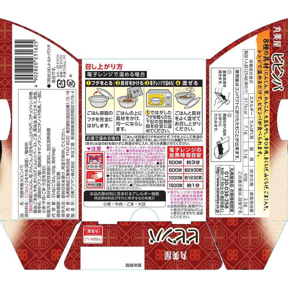 うるち米(国産)/酸味料、野菜(にんにん、筍、れんこん、大豆もやし、山くらげ)、コチュジャン、砂糖、醤油、ごま油、牛肉、きくらげ、にんにくペースト、ごま、香味油、魚介エキス、食塩、香辛料/調味料(アミノ酸)、増粘剤(キサンタン)、カロチノイド色素、(一部に小麦・牛肉・ごま・大豆を含む) エネルギー317kcal、たんぱく質7.1g、脂質5.1g、炭水化物60g、食塩相当量2.5g
