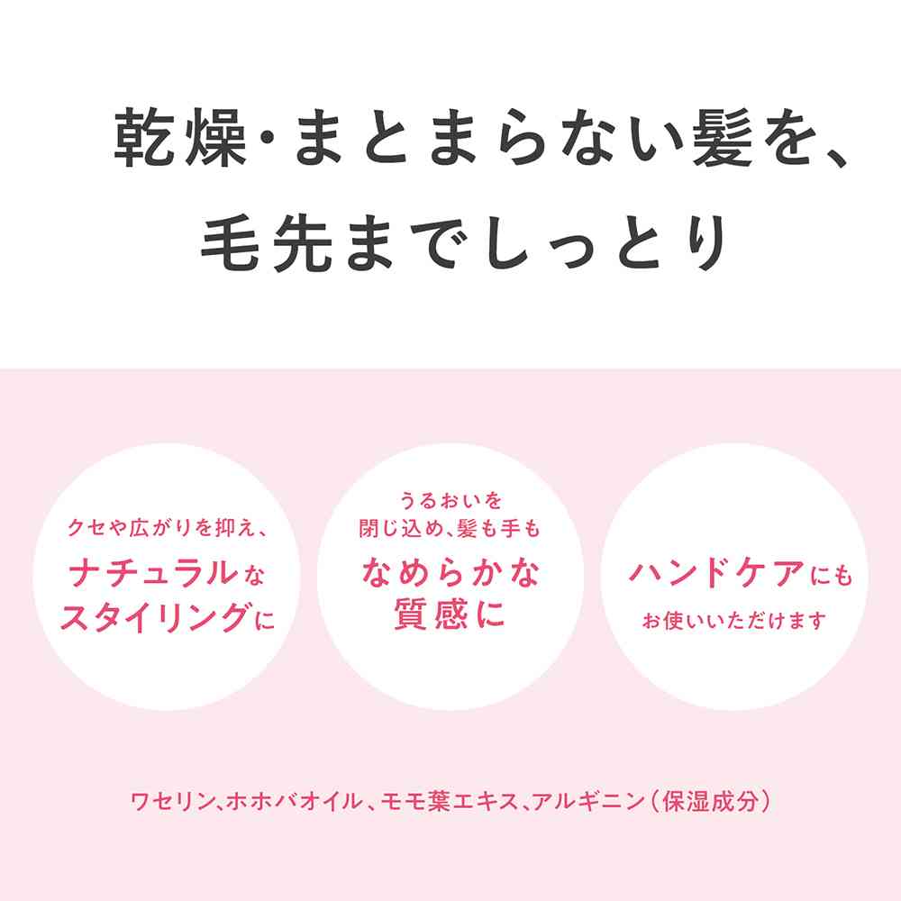 〇適量を手のひらでよく伸ばし、毛先から髪全体になじませます。乾いた髪・濡れた髪どちらにもお使いただけます。 〇ハンドクリームとしてお使いいただく場合は、適量を手肌のカサつきが気になる部分になじませてください。