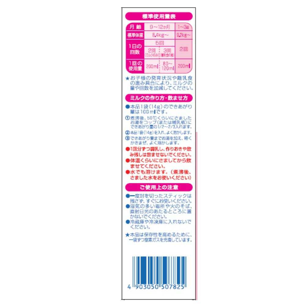栄養成分表示(100gあたり) エネルギー471kcal たんぱく質14.5g 脂質20.0g 炭水化物 58.9g 食塩相当量0.56g ビタミンA:360μg、ビタミンB1:0.7mg、ビタミンB2:0.8mg、ビタミンB6:0.7mg、ビタミンB12:1.2μg、ビタミンC:60mg、ビタミンD:6.5μg、ビタミンE:6.0mg、ビタミンK:15μg、ナイアシン:6.0mg、パントテン酸:5.7mg、葉酸:120μg、カルシウム:700mg、リン:350mg、鉄:9.0mg、カリウム:700mg、マグネシウム:80mg リノール酸:3.0g、α‐リノレン酸:0.5g、ドコサヘキサエン酸(DHA):53mg、リン脂質:350mg、ヌクレオチド:6mg、オリゴ糖:1.5g、β‐カロテン:40μg、塩素:450mg、灰分:4.0g、水分:2.8g <配合割合(100g当たり)> 乳成分:60.7g、調整脂肪:18.2g、可溶性多糖類(デキストリン)16.0g、その他(ビタミン、ミネラル、水分):5.1g <主要な混合物> 乳又は乳製品以外の乳成分(乳糖、乳清たんぱく質):32.2%、乳脂肪以外の脂肪(カノーラ油、パーム核油、大豆油、精製魚油):18.2% 乳糖以外の糖(デキストリン)16.0%