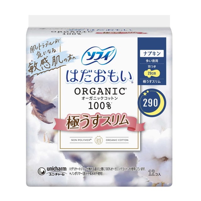 ソフィで、最も素材にこだわったオーガニックコットン100%シリーズ。デリケートゾーンが触れる上層にオーガニックコットン100%を使用しているから、かゆみの一因であるつきっぱなしの経血を肌に残しにくい。だから、肌への負担を低減し、肌に優しい。
