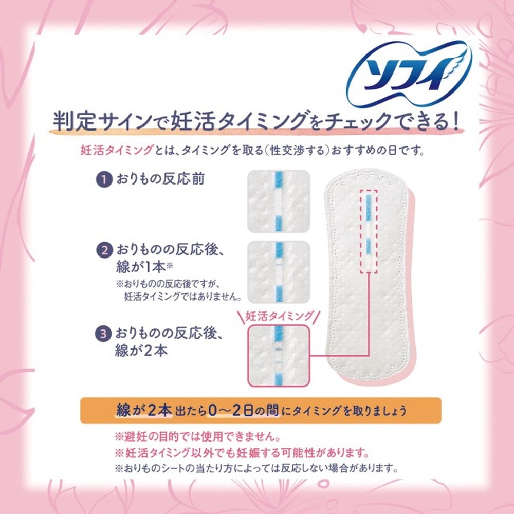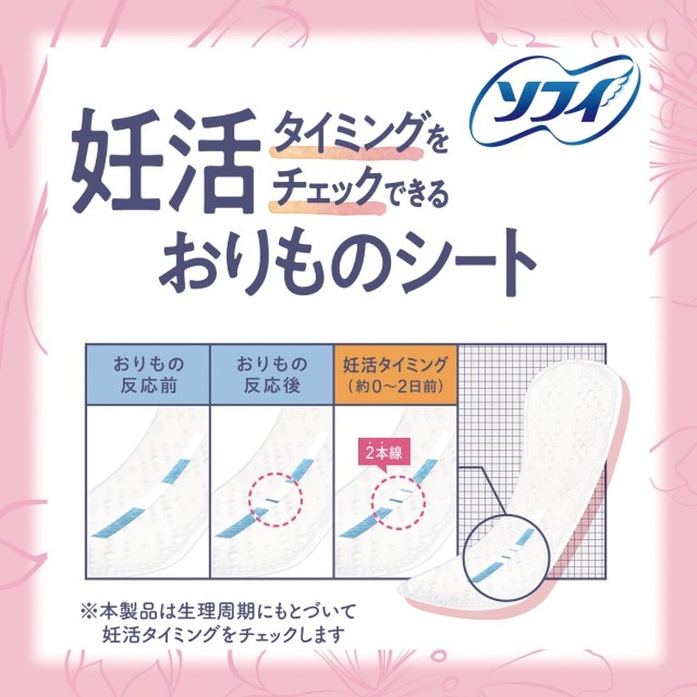 つけるだけ! 普段のおりものシートと同じようにつけているだけで妊活タイミングをチェックできるおりものシートです。 ・「ソフィ」が独自に開発したバイオテスター技術によって“おりもの“内の「妊活おしらせ物質」を捉えます。 ・おりものに反応し「妊活おしらせ物質」を検出すると、判定サイン部分に2本線が現れ、検出しなかった場合は1本線が現れます。 10枚入