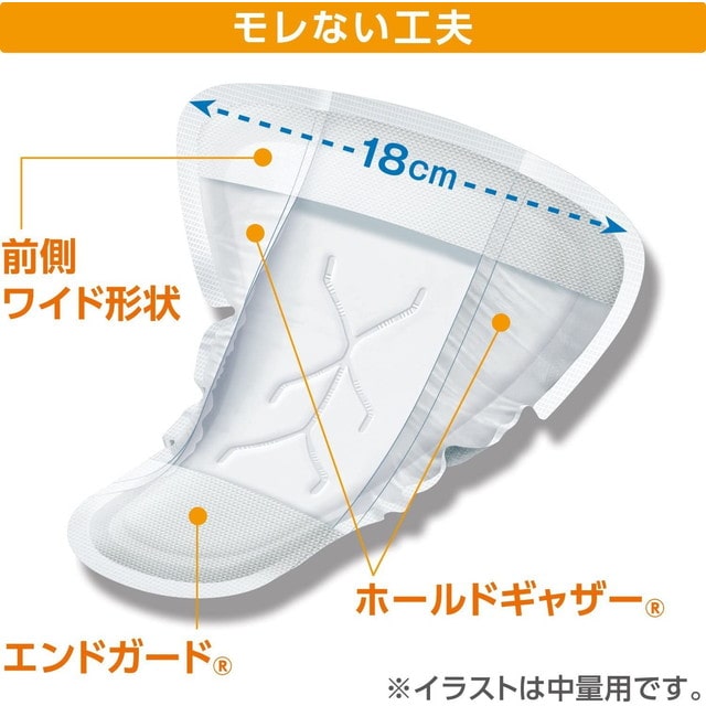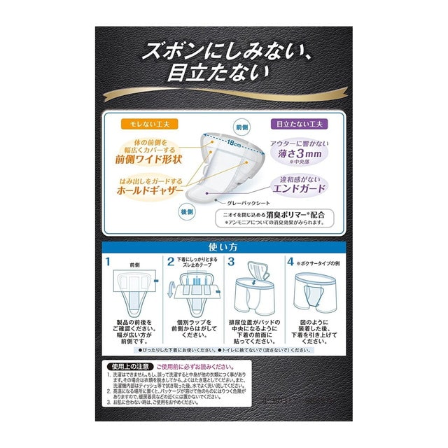 男性専用の「ズボンにしみない目立たない」軽い尿もれケアパッド 【もれない工夫】「前側ワイド形状」で体の前側を幅広くカバー。「ホールドギャザー」採用で、性器のはみ出しをしっかりガード。 【目立たない工夫】薄さ3mm(中央部)でアウターに響かない。やわらかい「エンドガード」を搭載で、違和感を低減。 【ニオイを閉じ込める消臭ポリマー*配合】 *アンモニアについての消臭効果が見られます。 吸収量:200c