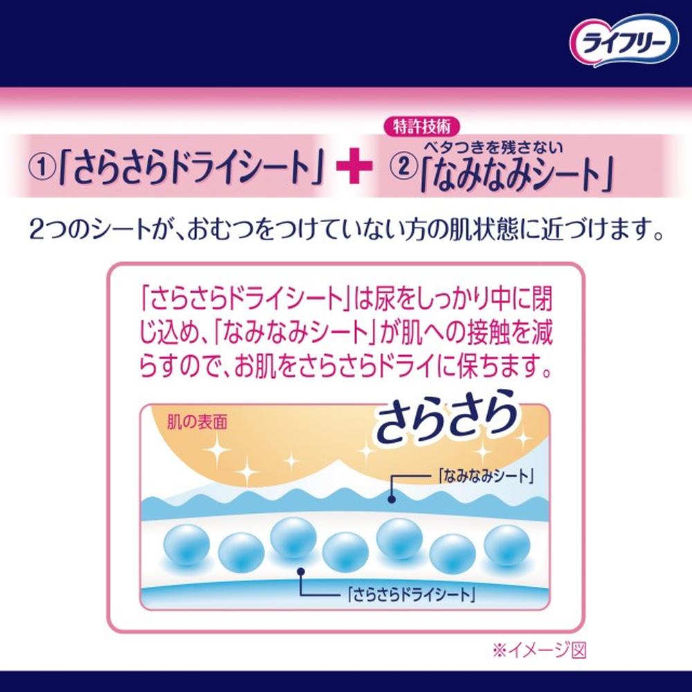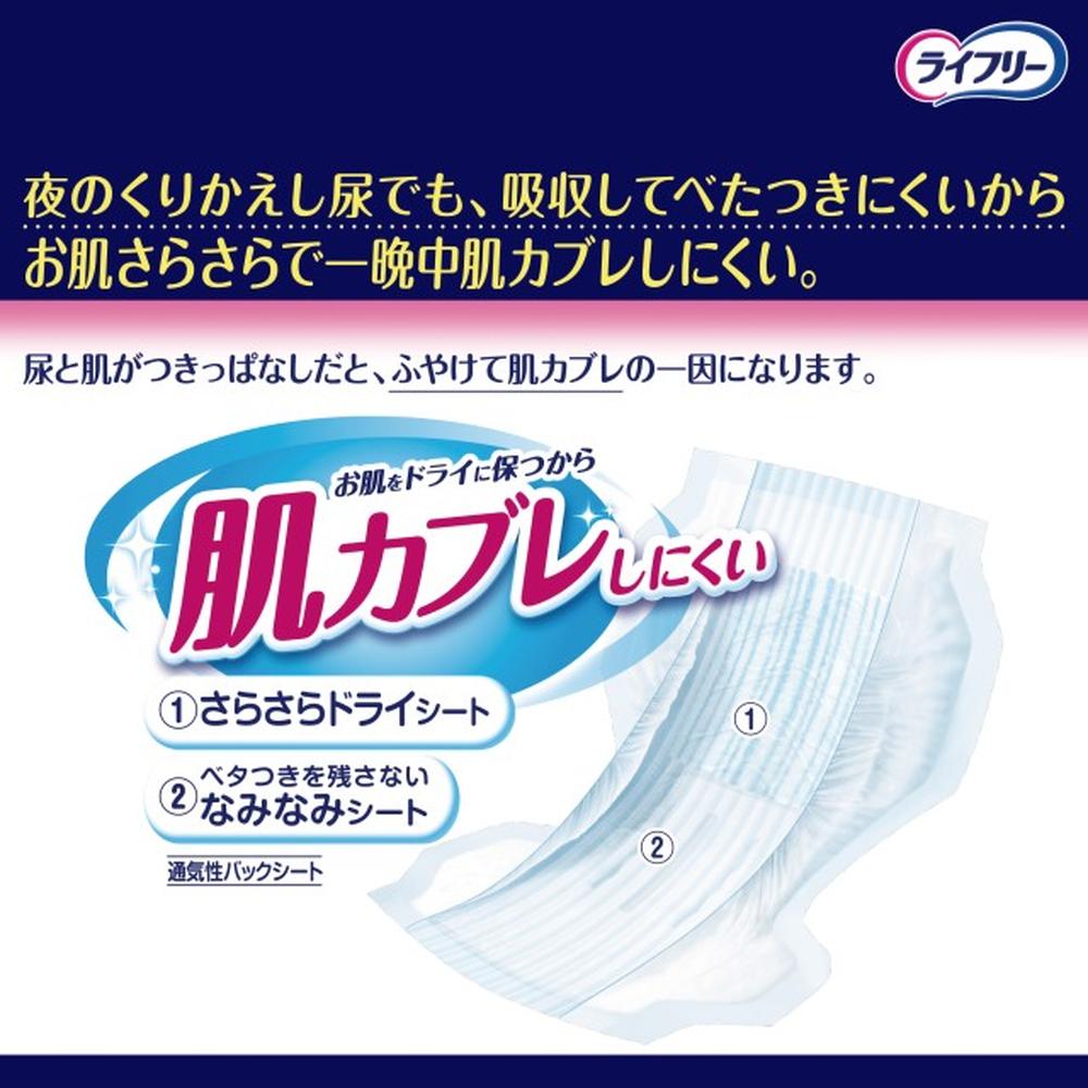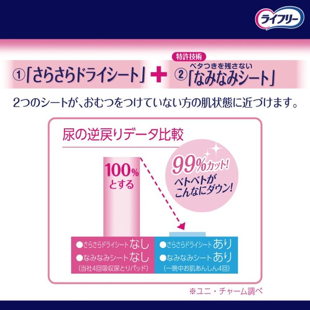 「さらさらドライシート」が尿をしっかり中に閉じ込め、逆戻りを低減するので、お肌をさらさらドライに保ちます。 新搭載の特許技術「なみなみシート」がベタつきを残しません。 おむつ内部の湿気を外に逃がして、ムレずにあんしん「通気性バックシート」採用。 たっぷり約4回分をぐんぐん吸収するので、尿量の多い方でも、一晩中あんしんです。