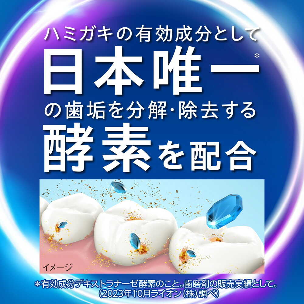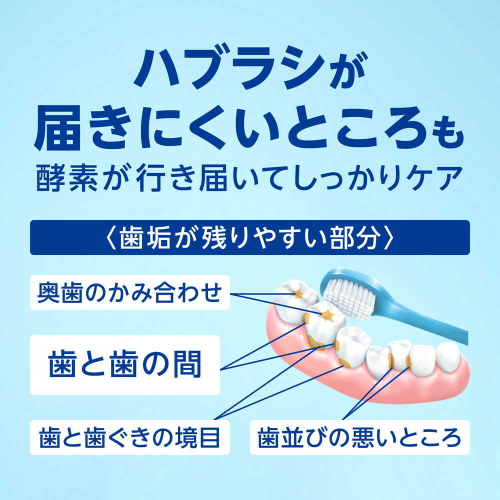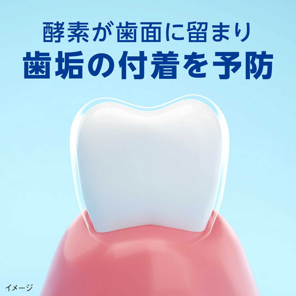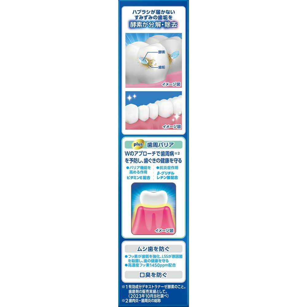 お口の様々なリスクの原因「歯垢」を、日本で唯一、分解・除去できる有効成分「酵素(デキストラナーゼ)」配合。 ●酵素が歯垢を分解・除去し、ツルツルな歯へ ●歯ぐきのバリア機能を高める作用と歯ぐき抗炎症作用のWのアプローチで、歯周病を予防し、歯ぐきの健康を守る ●高濃度フッ素(1450ppm)配合。フッ素が歯質を強化し、歯の健康を守る ●原因菌を殺菌、口臭を防ぐ <ナチュラルグリーンミントの香味>