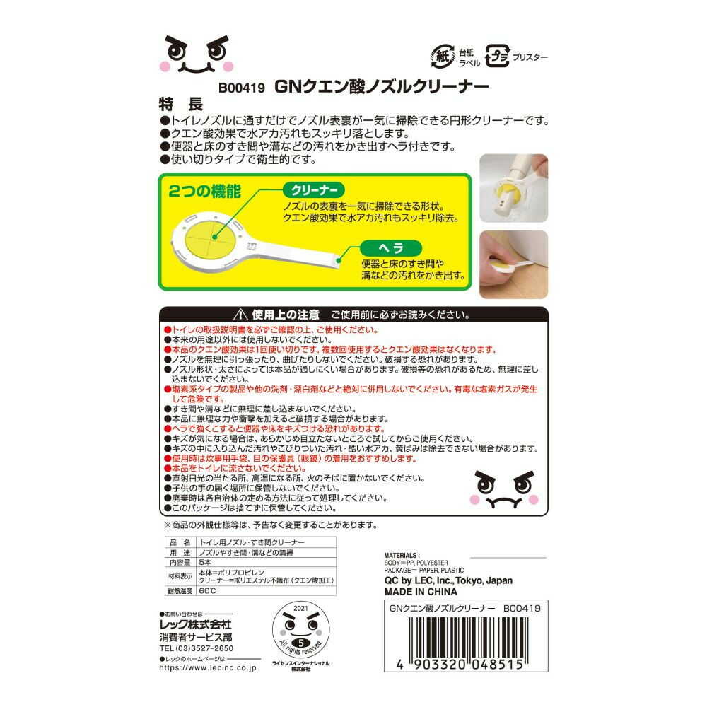 ●トイレノズルに通すだけでノズル表裏が一気に掃除できる円形クリーナーです。 ●クエン酸効果で水アカ汚れもスッキリ落とします。 ●ノズルだけでなく、便器と床のすき間や溝などの汚れをかき出すヘラ付きです。 ●使い切りタイプで衛生的。5本入りです。