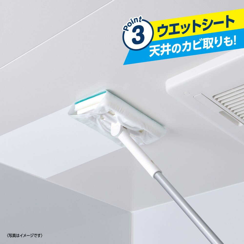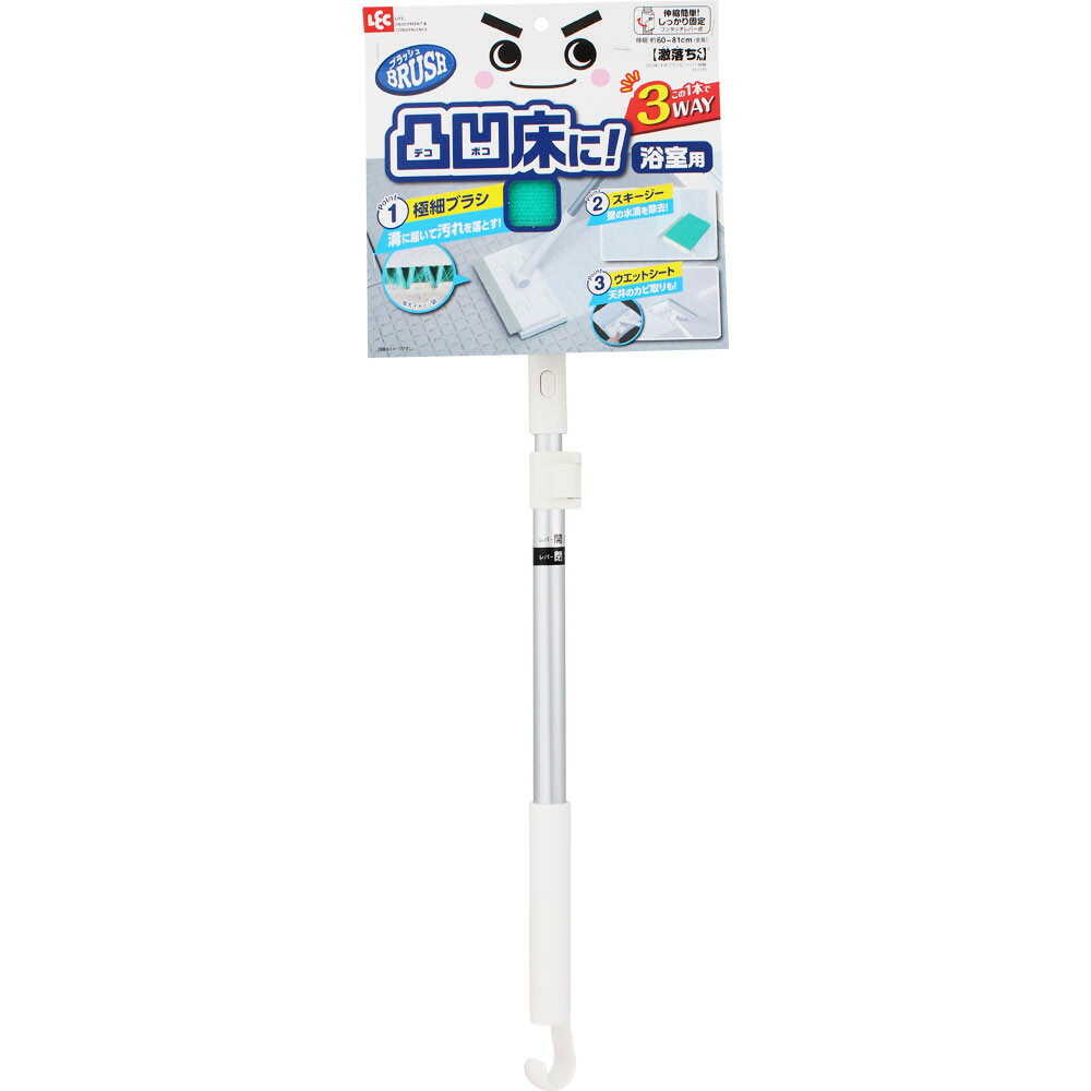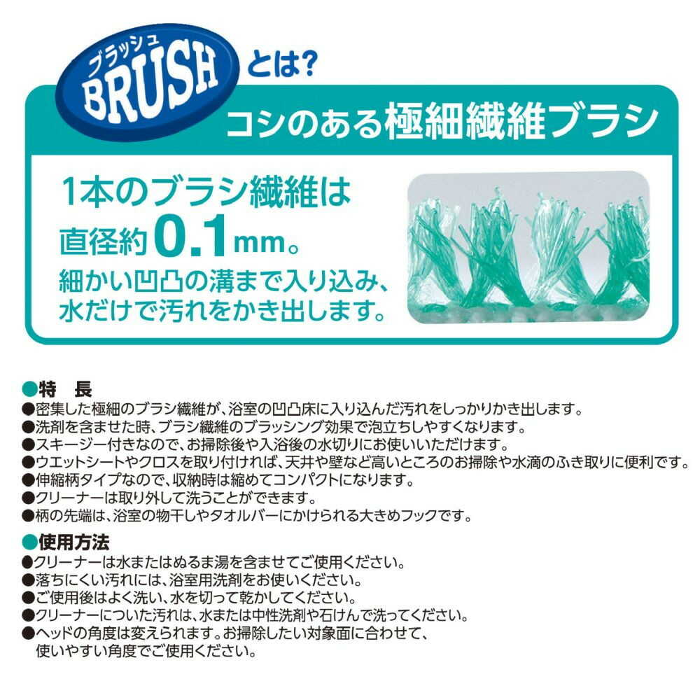 ●浴室の凸凹床を掃除するブラシです。 ●水だけで汚れをブラッシングできるブラシ・浴室壁の水滴を除去するスクレーパー・天井掃除用ウェットシート取り付けの3WAY機能 ●凸凹床の溝にも届く、1本約0.1mmのブラシ繊維を高密度に織り込んだ「BRUSH(ブラッシュ)」を採用しております。 ●ウェットシートを取り付けることで、天井のカビ取りにも使えます。 ●ワンタッチレバー式で60cmから81cmまで調節可能です。 ●クリーナーは取り外して洗うことができます。 ●「レック激落ちくん凹凸床・天井ブラシ&ワイパー(伸縮タイプ)スペア」(4903320164673)で取り替えることができます。