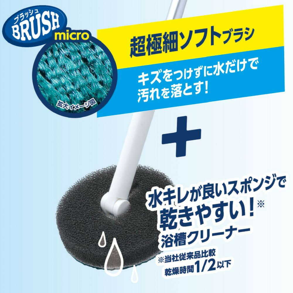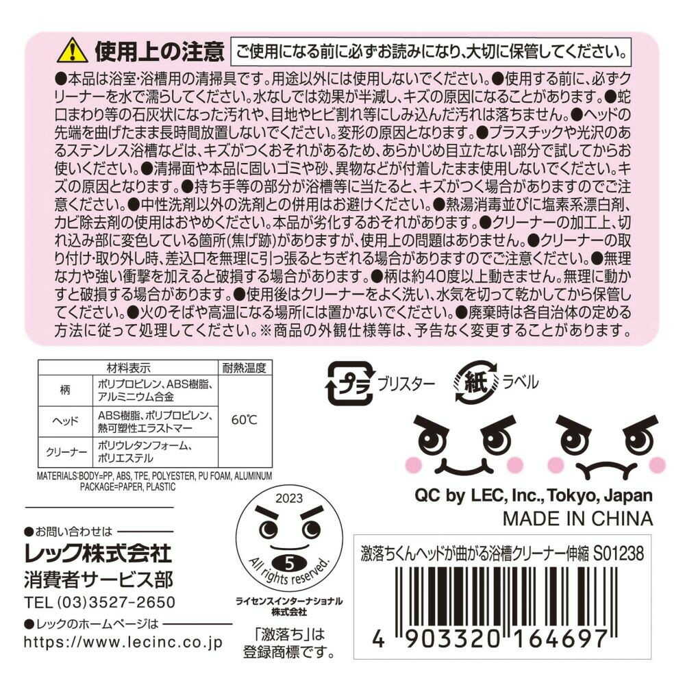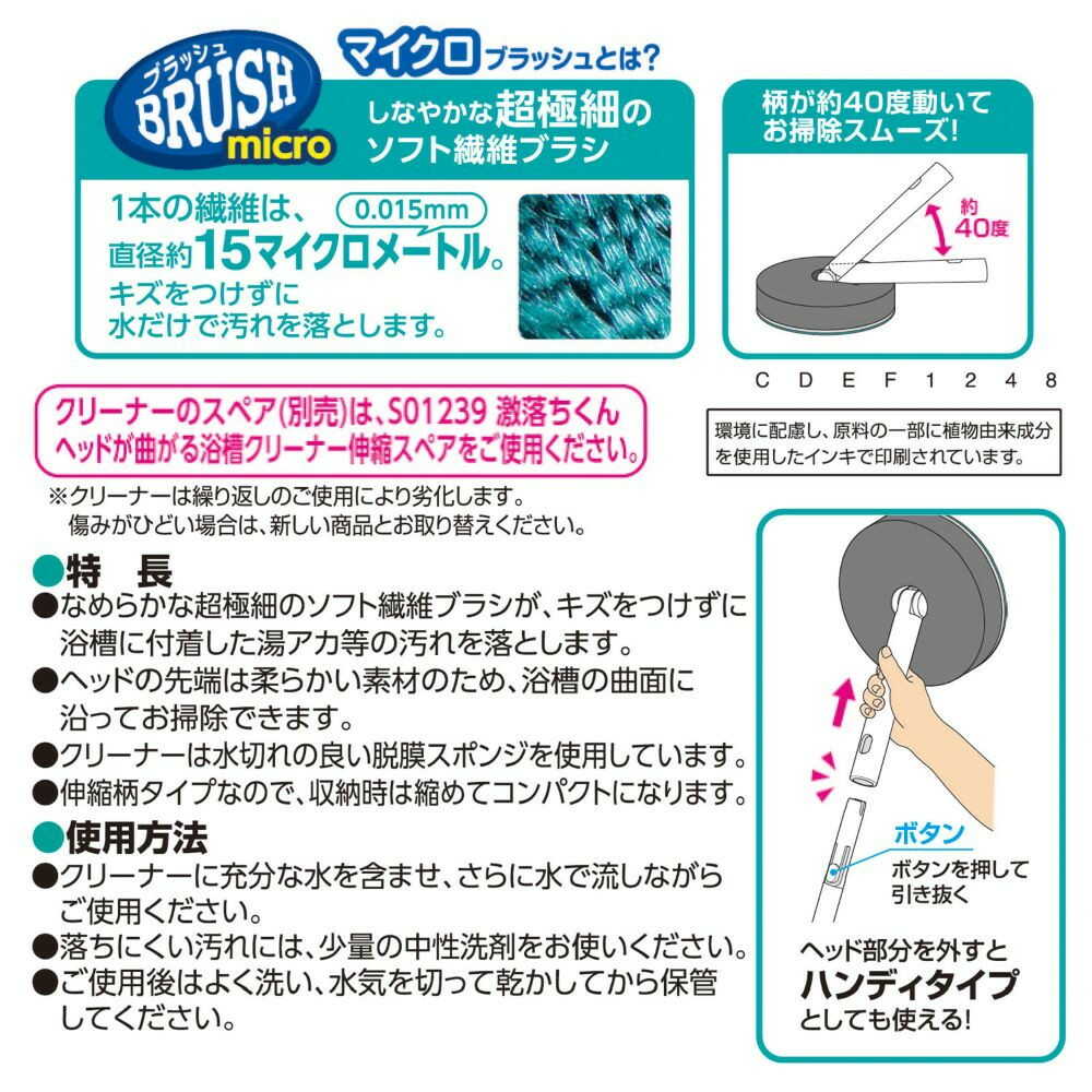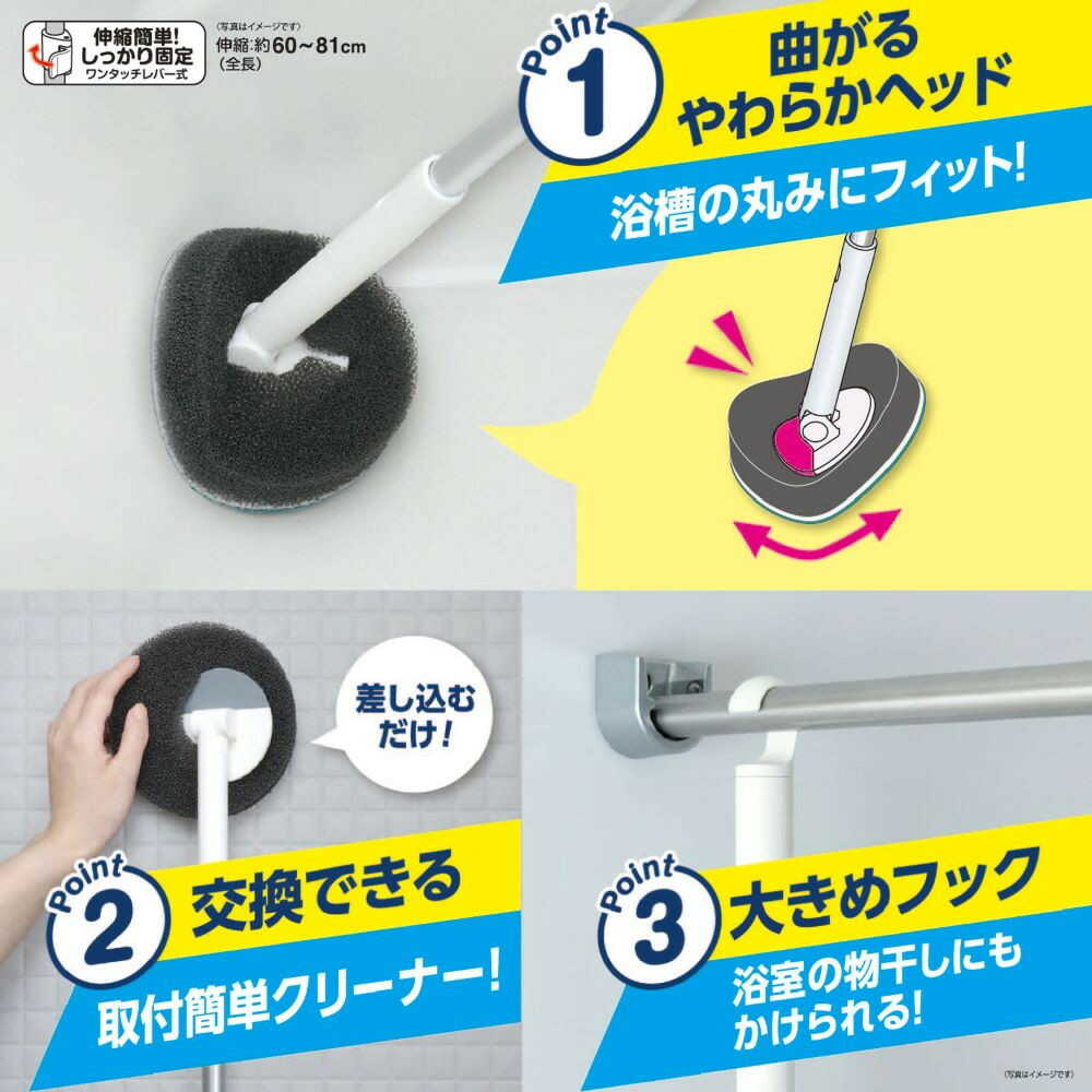 ●浴槽の湯アカを除去するブラシです。 ●なめらかな超極細のソフト繊維ブラシが、キズをつけずに浴槽に付着した湯アカ等の汚れを落とします。 ●ヘッドの先端は柔らかい素材のため、浴槽の曲面に沿ってお掃除できます。 ●クリーナーは水切れの良い脱膜スポンジを使用しています。 ●ヘッド部分を外すと、ハンディタイプとしても使えます。 ●ワンタッチレバー式で60cmから81cmまで調節可能です。 ●クリーナーは取り外して洗うことができます。 ●「レック激落ちくんヘッドが曲がる浴槽クリーナー(伸縮タイプ)スペア」(4903320164703)で取り替えることができます。