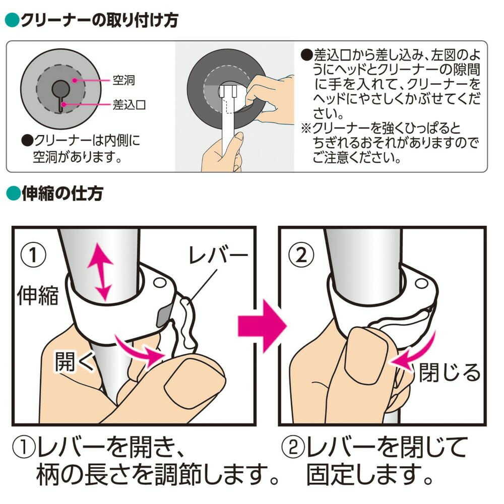 柄:ポリプロピレン・ABS樹脂・アルミニウム合金ヘッド:ABS樹脂・ポリプロピレン・熱可塑性エラストマークリーナー:ポリエステル・ポリウレタンフォーム