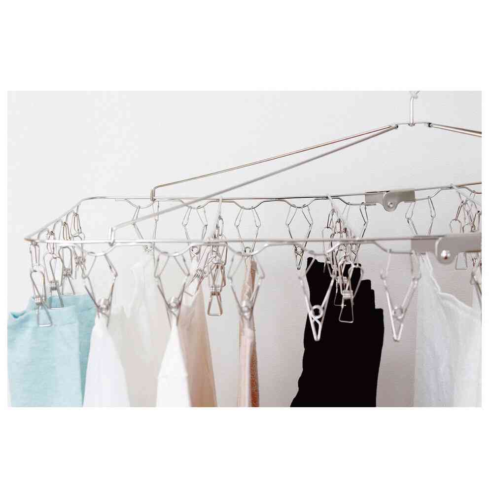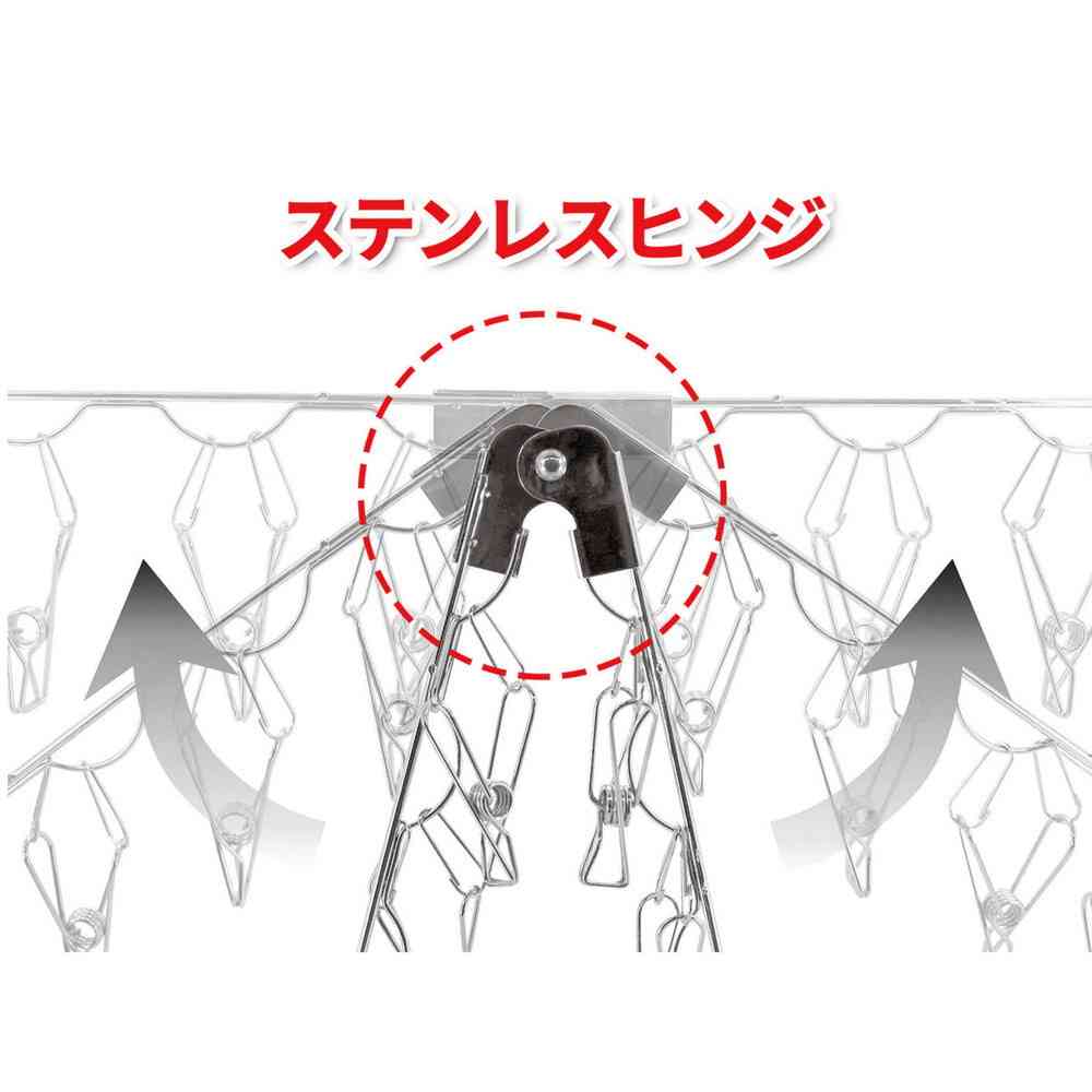 ●丈夫で長持ち!サビにくいオールステンレス製です。 ●W吊り金具のからまんピンチ採用で、からみにくく開閉がスムーズです。 ●マンションベランダなどに最適な低竿対応。竿まで約15cmなので、タオルやズボンなど長い物を干すときに便利です。 ●指を挟みにくく安全で、ねじれに強いステンレスヒンジを採用。 ●風が吹いても落ちにくいストッパー付きです。 ●コンパクトフレームなので省スペースで大量に干すことができます。 ●たっぷり42個のピンチ付きです。