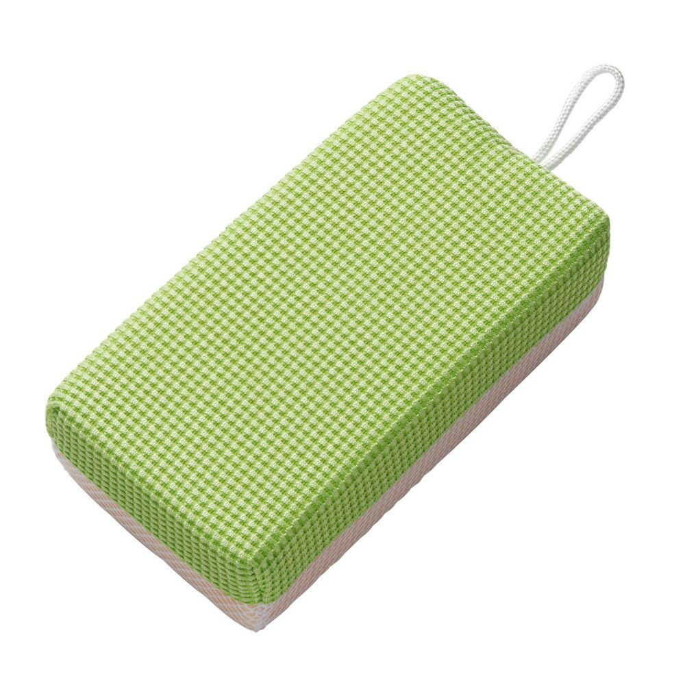 ●用途に応じて表裏の使い分けができる1つ2役のバス用スポンジです。 ●グリーンのクロス面は超極細繊維。キズをつけずに水だけでも汚れをすっきり落とします。 ●裏面はポリエステルネット。洗剤を含ませたときの泡立ちがよく、汚れ落ちもよいネットです。 ●収納に便利な吊り下げヒモ付きです。