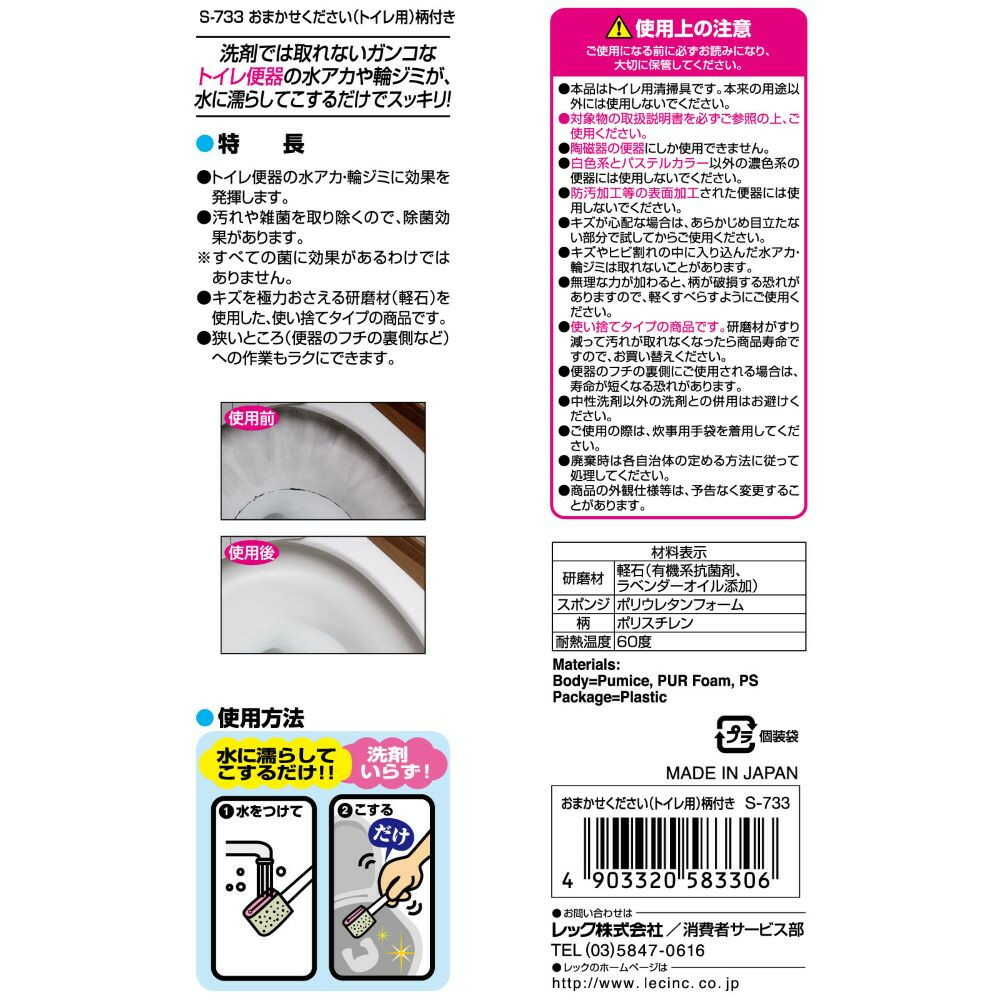 ●トイレタンクや便器の水アカ・輪ジミに効果を発揮します。 ●お掃除がしやすい柄付きタイプです。 ●洗剤では取れない頑固な汚れが、水に濡らしてこするだけでスッキリ! ●汚れや雑菌を取り除くので、除菌効果があります。※すべての菌に効果があるわけではありません。 ●キズを極力おさえる研磨材(軽石)を使用した、使い捨てタイプの商品です。 ●スポンジタイプなので、狭いところ(水道の蛇口の付け根など)への作業も楽にできます。