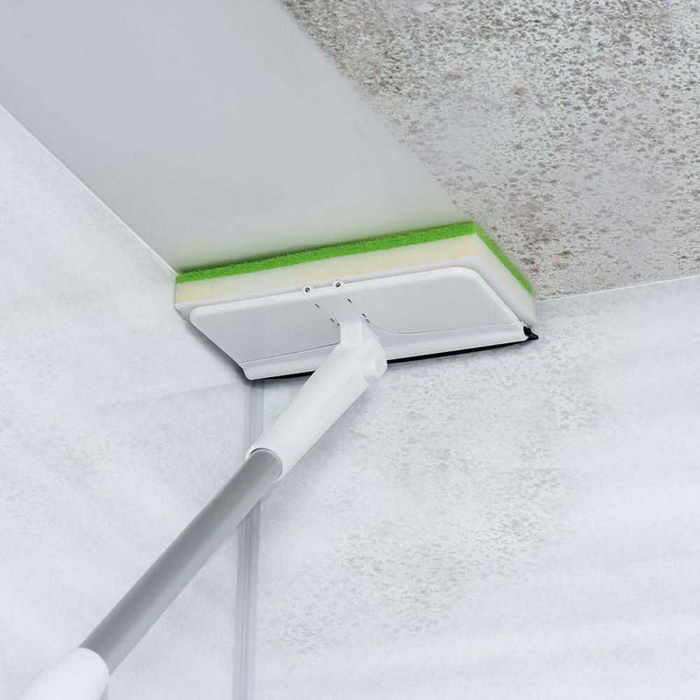 天井・壁用 浴室の頑固な汚れ・黒カビに! 2WAYワイパー 研磨材入りクリーナー 天井に! 水に濡らしてこするだけ 洗剤いらず ●研磨材入り不織布クリーナーが、水だけで汚れを落とします。 ●クリーナーは面ファスナー取り付けなので、簡単に交換できます