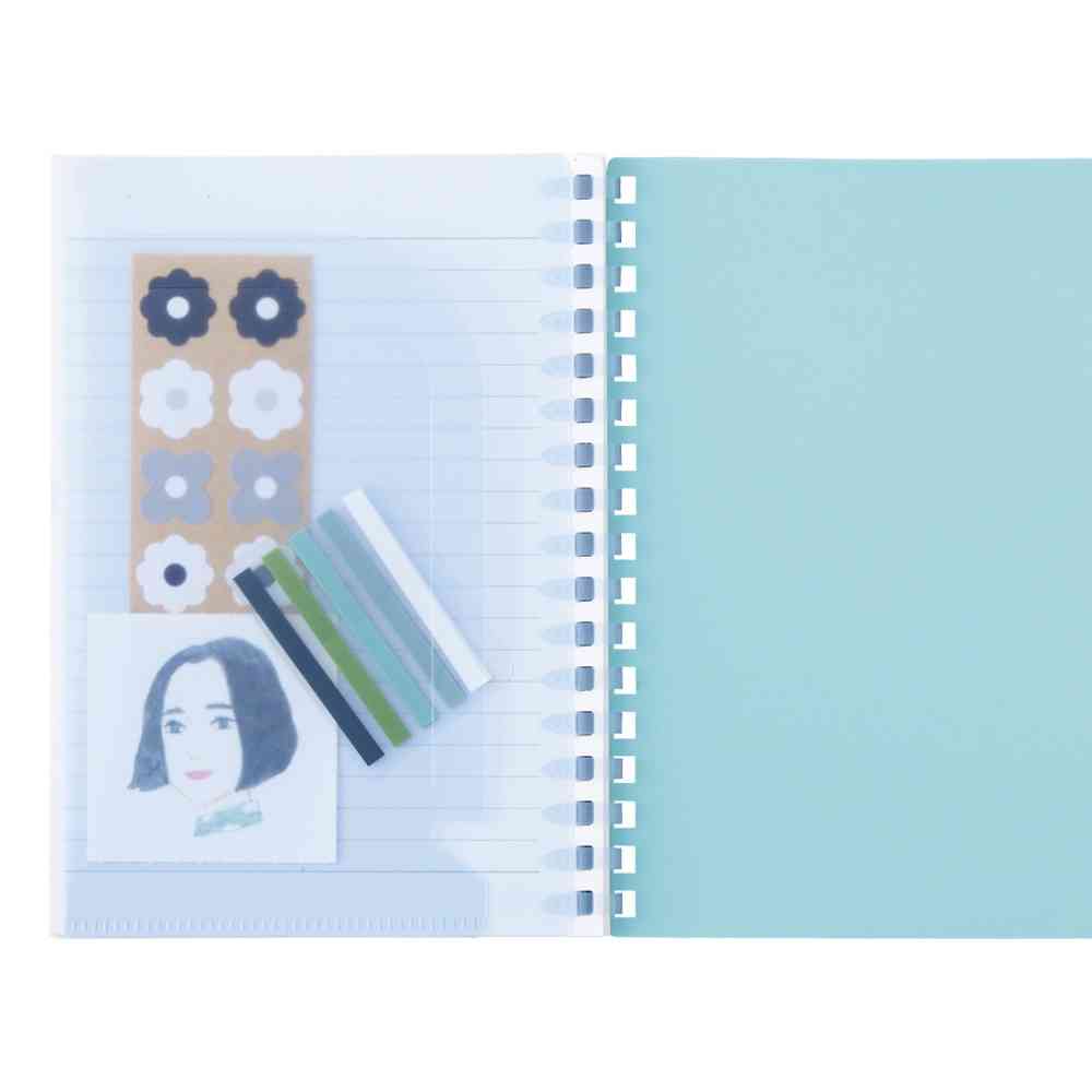 表紙の色に合わせた色透明リング。 光が当たると反射する金色の箔押し。 やわらかくて薄いリングは、筆記時に手が当たっても気になりにくい仕様です。 かさばらず持ち運びにも便利です。 使いおわったノートのリングをハサミで切ってリーフを取り外し、ツイストノートやオープンリングノートにとじることができます。(※一般的なルーズリーフバインダーにはとじることができません。) また、簡単に分別廃棄できます。 収容枚数:リーフ30枚