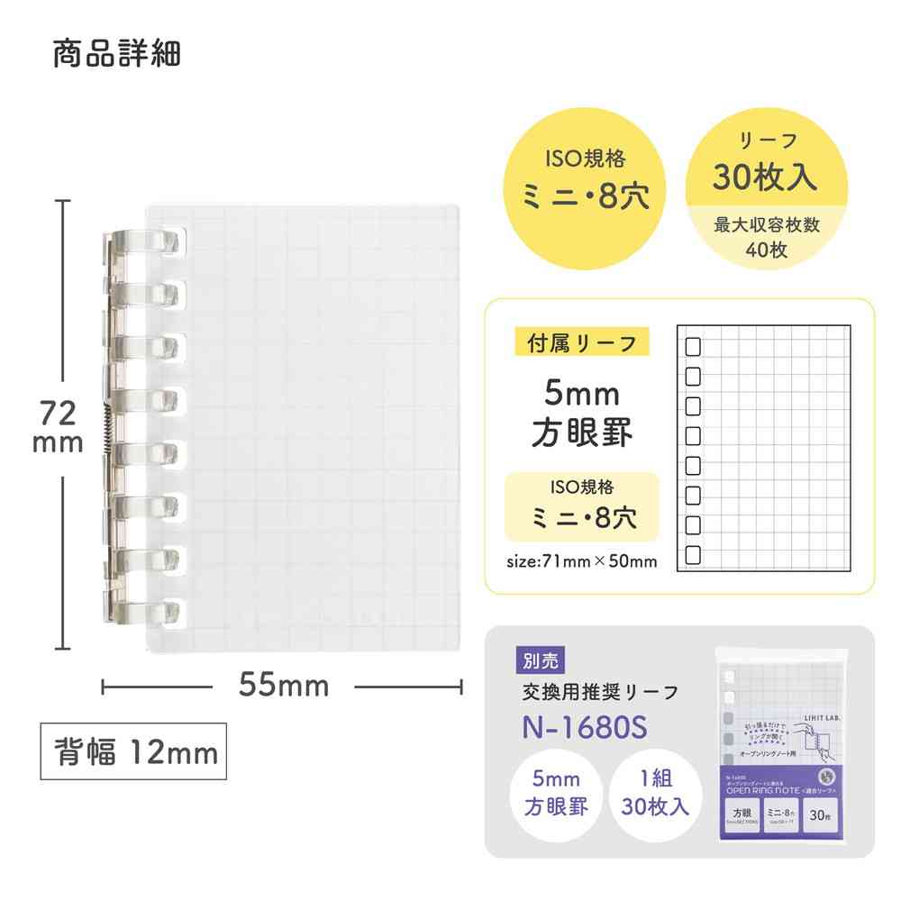 大人気のオープンリングノートにコンパクトなミニサイズが新登場! とじ具が開いてリーフの交換ができるミニサイズの可愛いノート。 表紙は淡くおだやかな全10色。 小さくて可愛い手のひらサイズのノートで、ちょっとしたメモ書きに便利です。 透明のポーチに入れて、バッグチャームとして可愛く持ち運びができます。 収容枚数:リーフ30枚