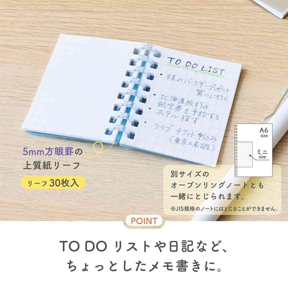1/3インチピッチシリーズミニ、タテ型、リングノート、ルーズリーフ、コンパクト、手のひらサイズ、キーホルダー