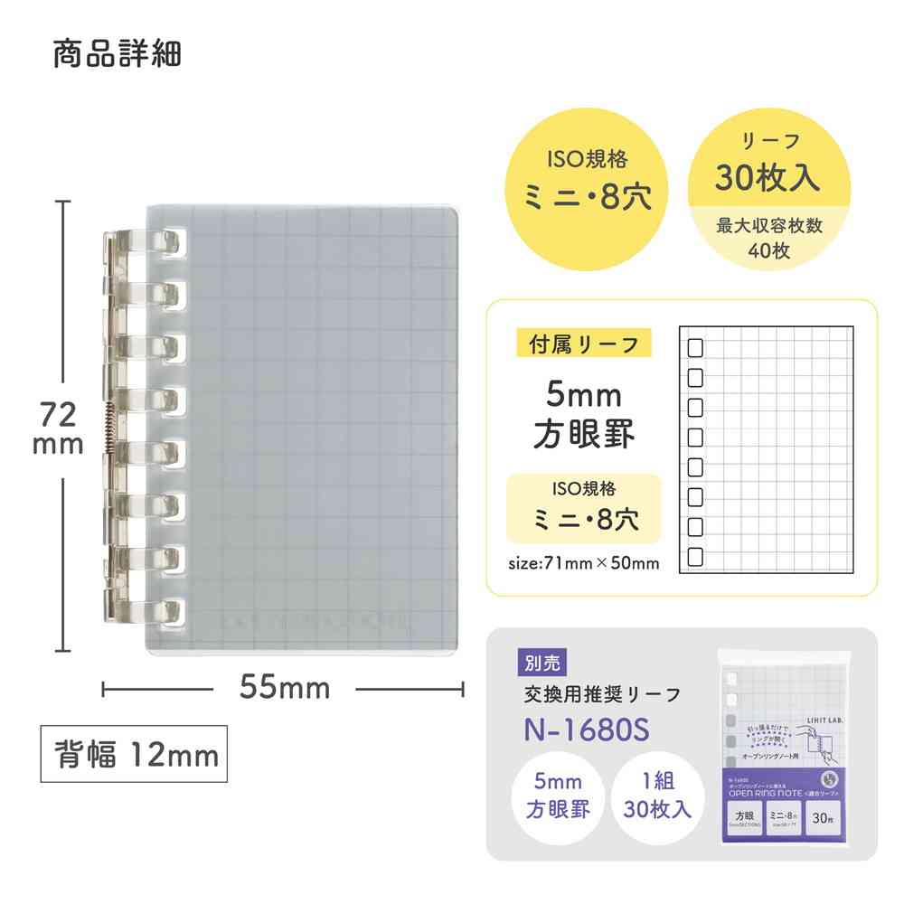 大人気のオープンリングノートにコンパクトなミニサイズが新登場! とじ具が開いてリーフの交換ができるミニサイズの可愛いノート。 表紙は淡くおだやかな全10色。 小さくて可愛い手のひらサイズのノートで、ちょっとしたメモ書きに便利です。 透明のポーチに入れて、バッグチャームとして可愛く持ち運びができます。 収容枚数:リーフ30枚
