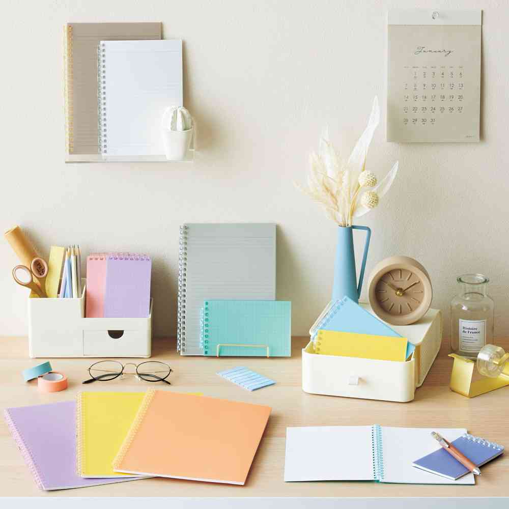 とじ具が開くのでリーフの差替えが可能。 とじ具は表紙の色に合わせた色透明。360°折り返して使えるので省スペースで使いやすい。 ロゴはどんな持ち物にも合わせやすい空押し加工。 あけるとき:リーフを持ち、斜めに軽く引くと、とじ具が開きます。 とじるとき:リングをつまみ、指を滑らせて音がするように順番に閉じると簡単です。 収容枚数:リーフ40枚