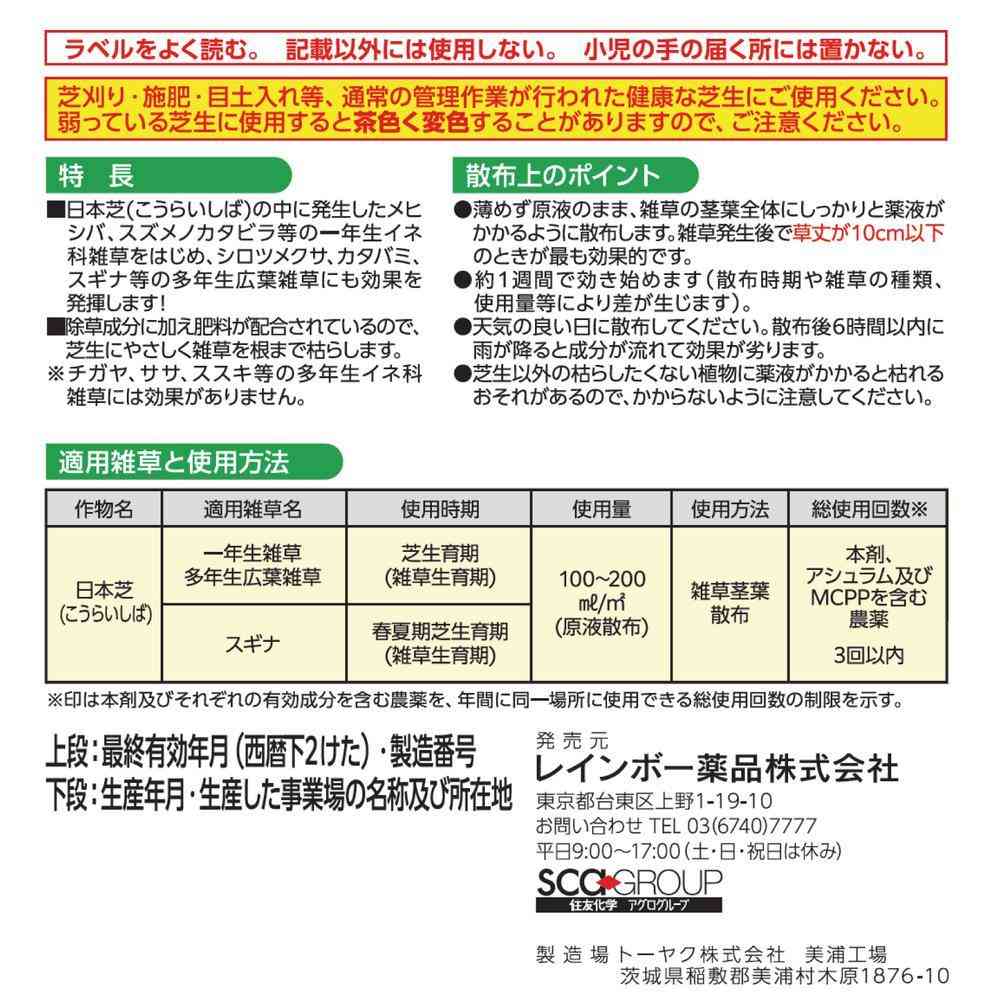 商品説明スズメノカタビラ等1年生イネ科雑草と広葉雑草に効果。 枯らしずらいクローバ、カタバミ等にも高い除草効果を発揮、肥料が配合されて芝生イキイキ。