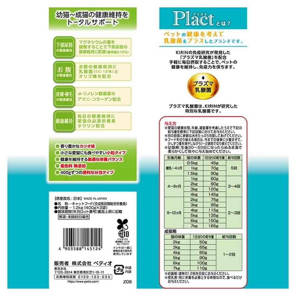 Plactはペットの健康を考えて乳酸菌をプラスしたブランドです。 プラズマ乳酸菌による免疫ケアに加えて、愛猫の健康をトータルでサポート! 下部尿路、お腹、皮膚・被毛ケア。 タウリン配合。 着色料無添加。 香り豊かなカツオ味。