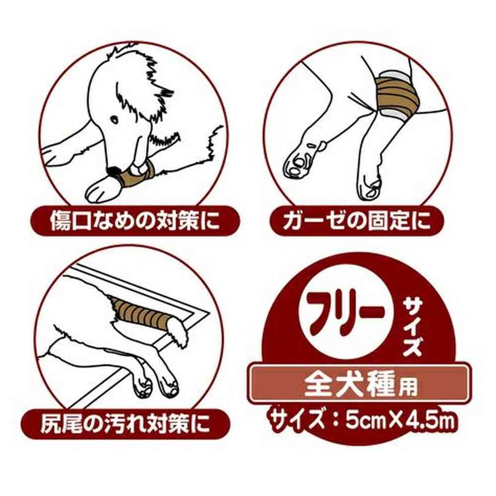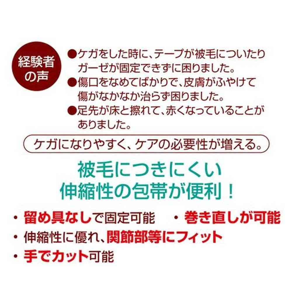 ●本品は犬用です。犬以外には使用しないでください。 ●ラテックスアレルギー体質の人や犬は使用しないでください。 ●使用前に破損箇所がないかを必ず確認してください。 ●汚れが目立ち始めたら新しく巻き直してください。 ●犬の健康状態を確認のうえ、使用してください。 ●使用部位に傷・炎症・床ずれ・骨折等がある場合は、直接皮膚に巻かないでください。万一、異常が見られた場合は直ちに使用を中止し、獣医師に相談してください。 ●強く引っぱり、しめすぎないように注意してください。伸縮性が高い為、血液障害を起こしたり、皮膚を傷つける恐れがあります。 ●長時間の使用は避けてください。 ●本品を犬がかんだり、引っかいたりしないように注意してください。かみグセのある犬には使用しないでください。 ●犬が嫌がる場合は、無理に使用しないでください。 ●幼児・子供には使用させないでください。 ●火気や水気のそばでの使用や保管はしないでください。 ●幼児・子供・ペットのふれない所に保管してください。