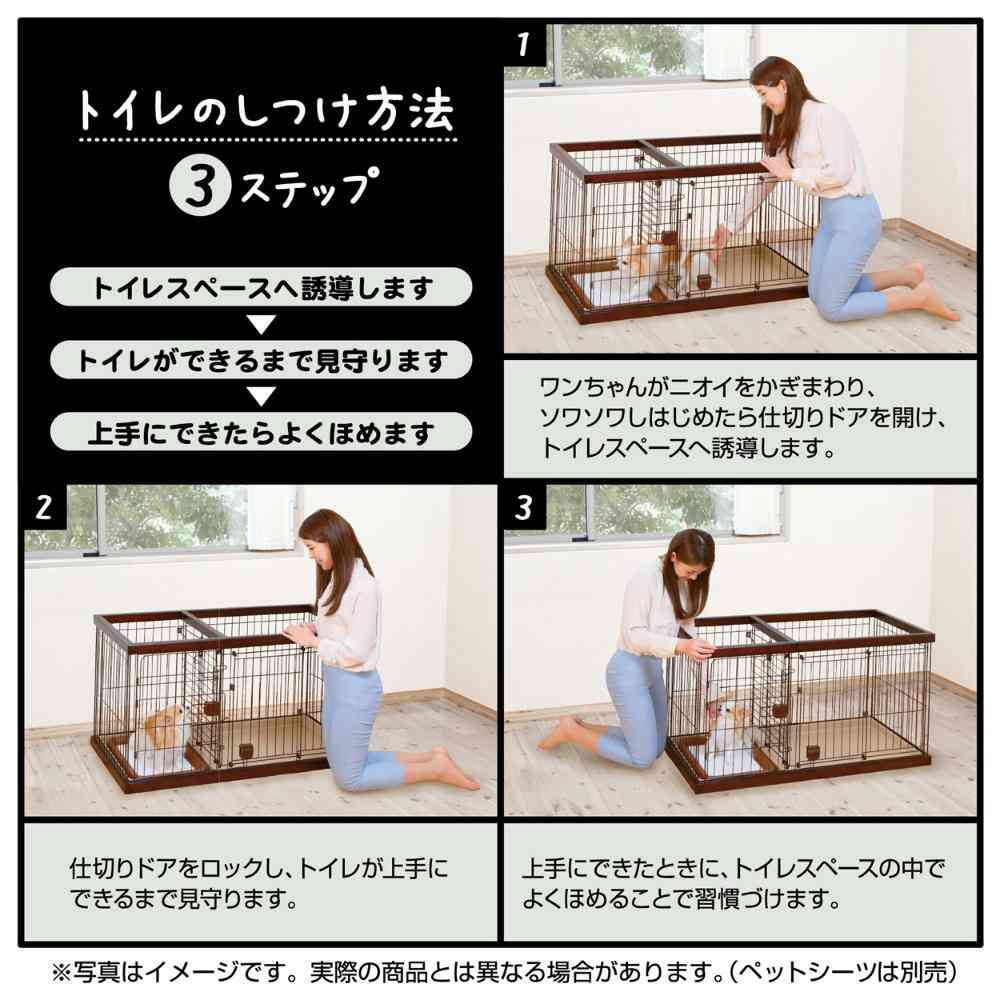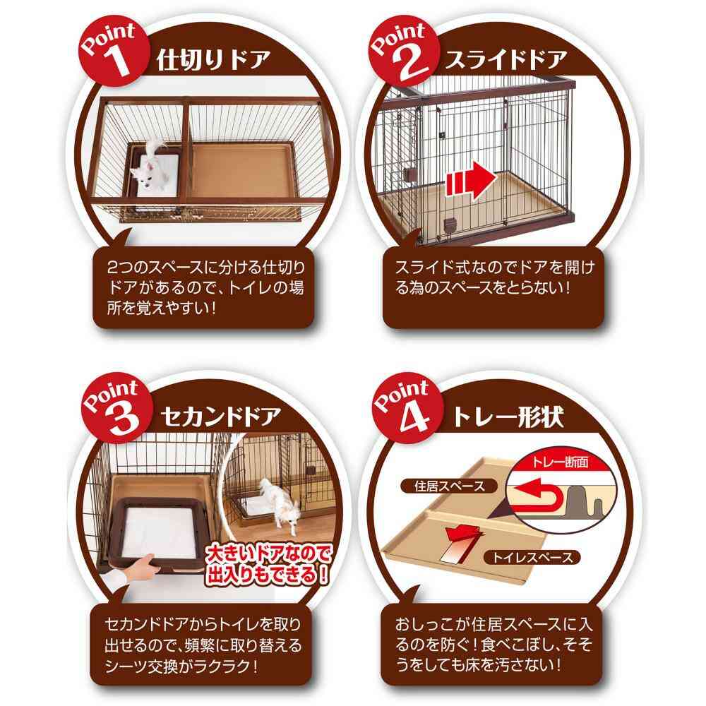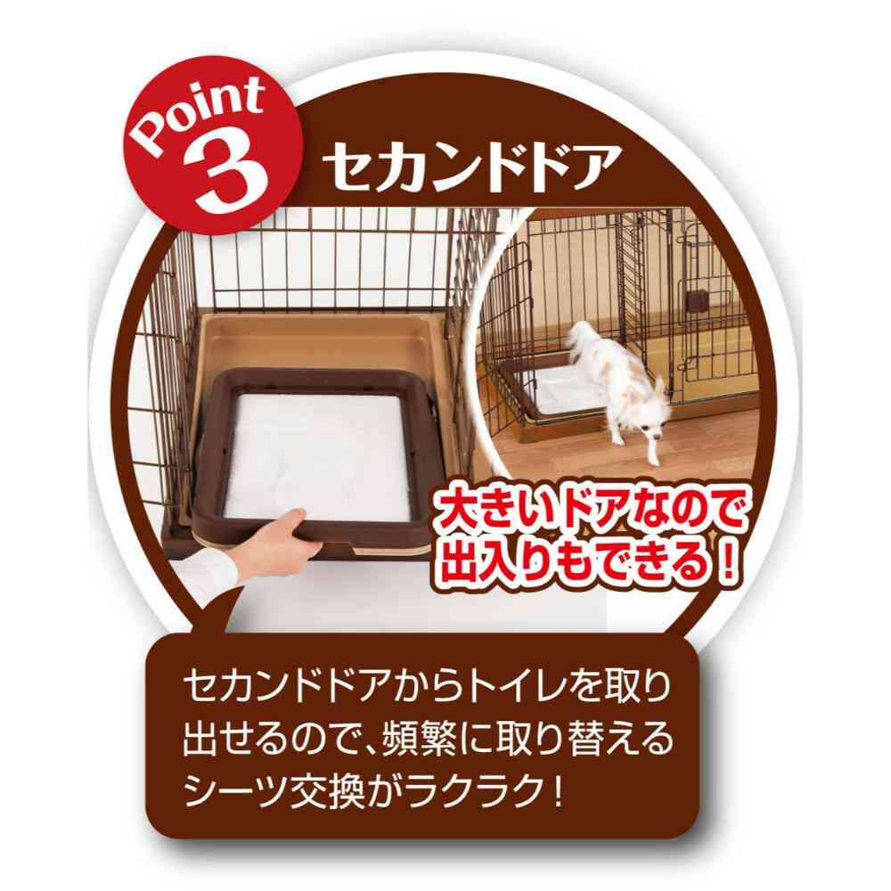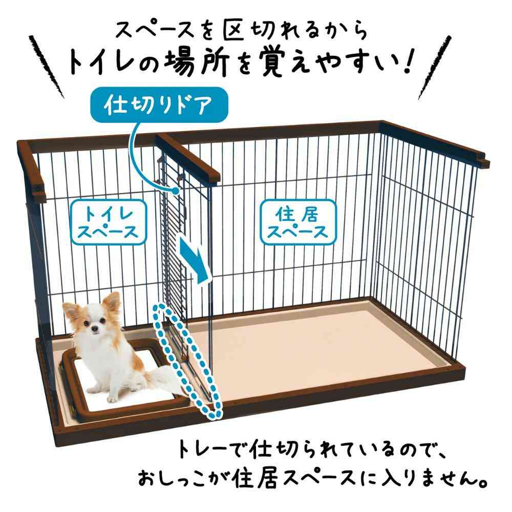 ・トイレと住居スペースを区切れるから、トイレの場所を覚えやすい! ・住居側は横スライドドアで開閉がスムーズ。 ・トイレ側はドアが大きく開き、ワンちゃんの出入りやシーツ交換もラクラク! ・ぴったりサイズのトイレトレー付き! ・超小型犬向き。