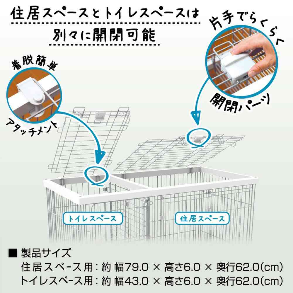 ・ワンちゃんの飛び出し防止に! ・用途に応じて開閉、着脱が可能! ・トイレスペース、住居スペースそれぞれが自由に開閉。 ・着脱簡単アタッチメント付。片手で操作できるロック機構。