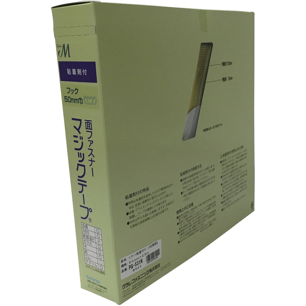 ●箱入りなので、お好みの長さでカットして保管もできて、最後まで汚れず使用できます。●粘着付で固定したい箇所への貼り付けが容易です。●フック側とループ側をを合わせると着脱が容易です。●色:ホワイト●幅(mm):50●長さ(m):25●厚さ(mm):2●タイプ:フック側●包装形態:箱●BOX入り 質量1120g