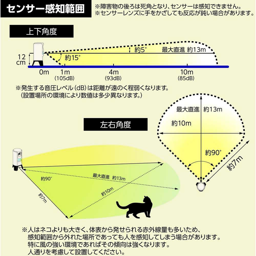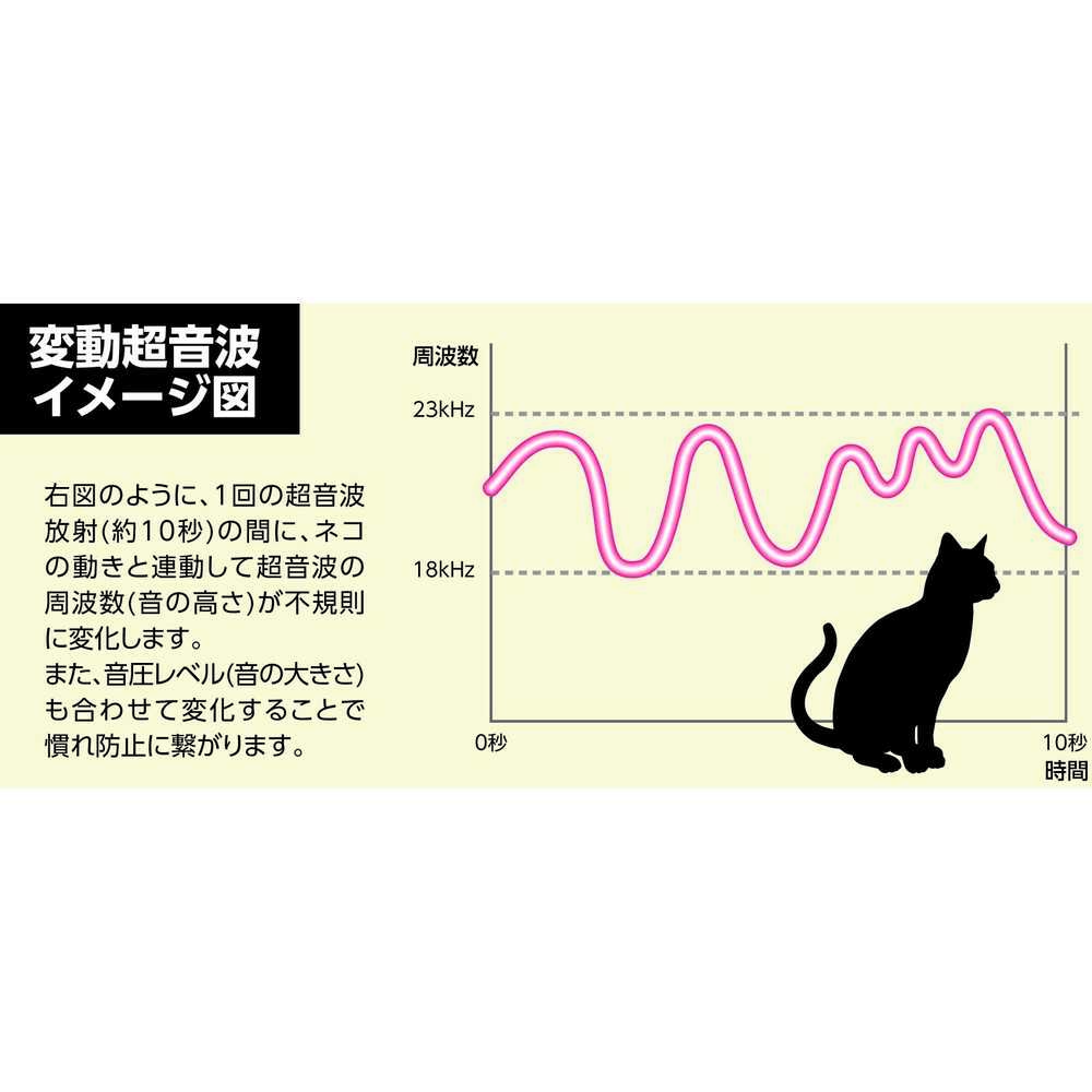 ●赤外線センサーで猫の動きをキャッチし、その動きに合わせて変動する不快な超音波を放射することにより感知エリアから遠ざけます。●動物愛護の観点から傷つけず1~2週間かけて学習させ、猫の糞害などを防ぎます。●波長の変化で慣れを防止します。●繰り返し使える充電式のため、乾電池購入の必要がありません。●購入後1年以内であれば無償修理可能。●使用目安:充電1回あたり約1500回作動●有効面積([[M2]]):100●幅(mm):123●奥行(mm):111●高さ(mm):230●電源(V):7.4●消費電力(W):0.37●本体寸法(mm)奥行:111●本体寸法(mm)高さ:230●本体寸法(mm)幅:123●充電式 質量555g