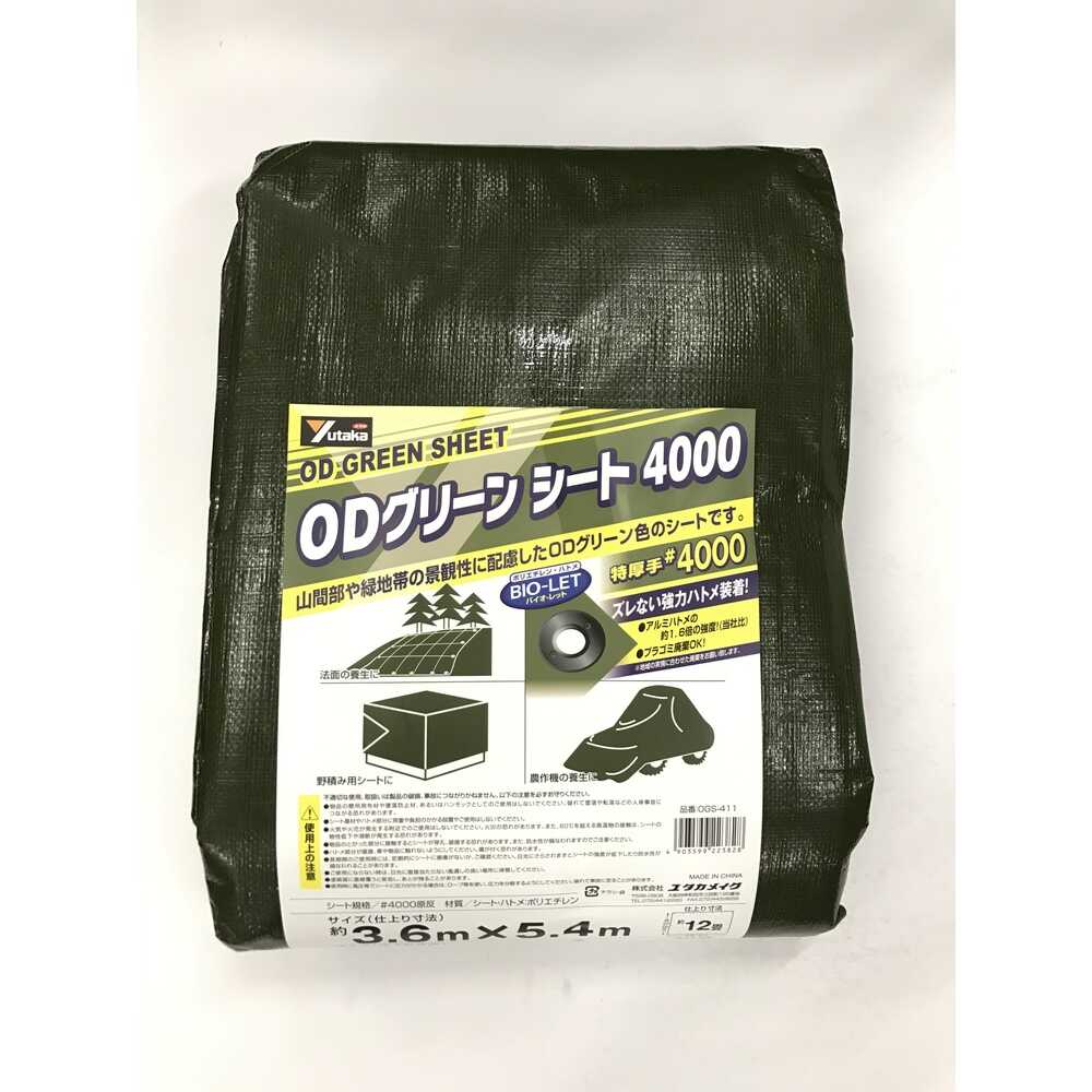 ●紫外線耐候剤配合で防水性が高いです。●超厚手#4000タイプです。●色:ODグリーン●幅(m):3.6●長さ(m):5.4●厚さ(mm):0.31●ハトメ数(個):20●ハトメピッチ(cm):90●番手(#):4000●耐久期間:約2~3年●引張強度:縦794N/5cm、横579N/5cm●厚さ:0.31mm 質量4kg