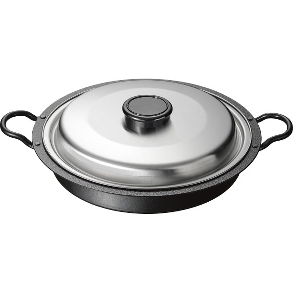 ●深さ約4.4cm●ガスコンロ可、100・200V電磁調理器対応●商品サイズ:現品約39.5×31×9cm・本体重量=約1.7kg●商品材料:本体=鉄(シリコン塗装)、蓋=ステンレス