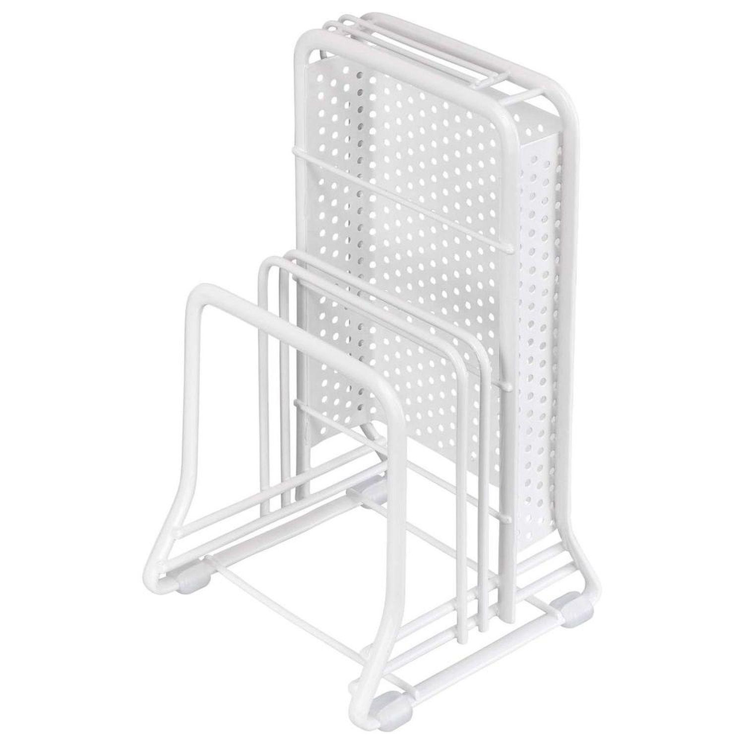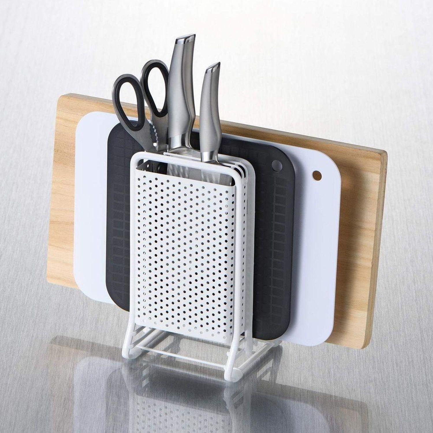 システムキッチンに合わせてスタイリッシュにスペースを有効活用できます。複数のまな板をコンパクトに収納できるまな板&包丁スタンドです。まな板1枚、シートまな板2枚、包丁2本、キッチンバサミを収納できます。鉄に粉体塗装を施し、丈夫でサビに強く耐久性があります。脚部は傷つけにくいシリコーンゴム付きです。