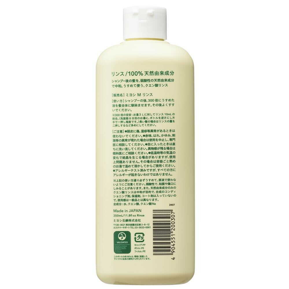 無添加石けんシャンプーでの洗髪後は、きしみを和らげる弱酸性のクエン酸リンスで洗い上がりスッキリ。香料・着色料・防腐剤はもちろん、合成界面活性剤のコンディショニング剤や保湿剤なども一切加えていません。薄めて使うタイプだから、経済的です。(300倍に薄めて使うタイプ)