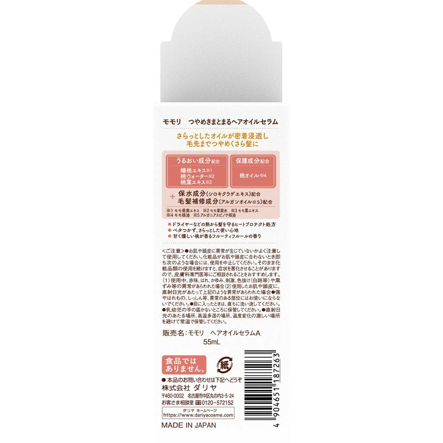 ●4種の桃由来成分(うるおい成分・保護成分)と保水成分を配合。 ●さらっとしたオイルが密着浸透し毛先までつやめくさら髪に。
