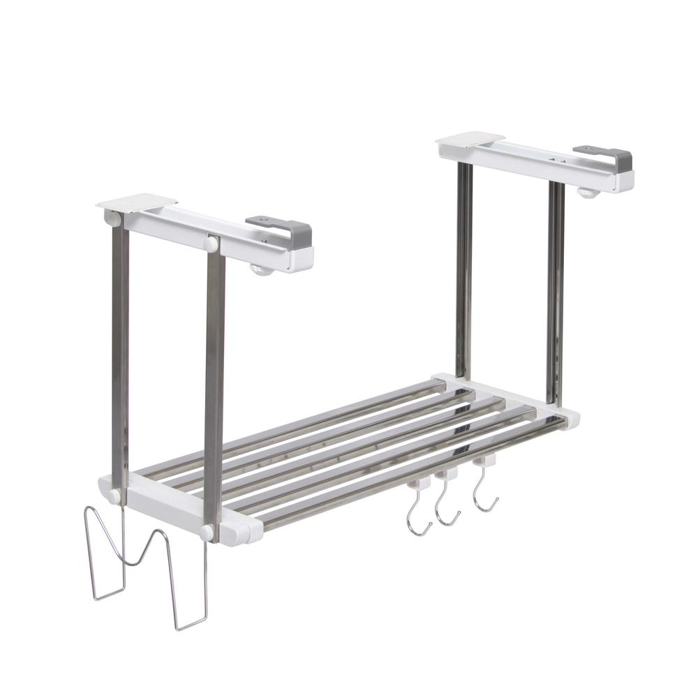 ●取付は吊戸棚の底板をはさんでネジでしめるだけ。 ●棚は、錆に強く清潔なステンレスを採用しています ●設置場所に合わせて55~95cmまで伸縮できます。 ●底板の厚さが1.5~3cmまでの吊戸棚に取付けられます