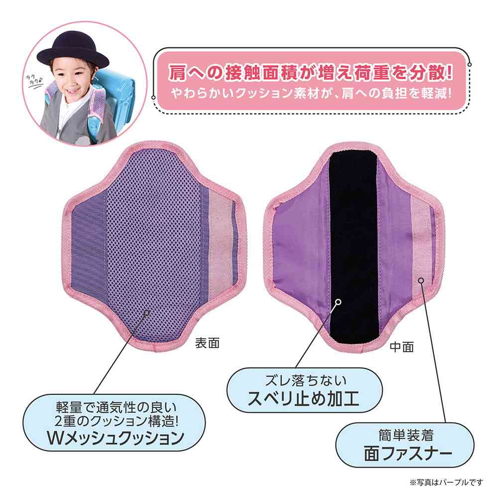 やわらかクッションで、ランドセルの肩への負担を軽減! ・肩への接触面積が増え荷重を分散します。 ・やわらかいクッション素材が、肩への負担を軽減します。 ・軽量で通気性のよい2重のクッション構造。 ・ズレ落ちないスベリ止め加工。 ・面ファスナーで簡単装着。 ・肩ベルト幅、最大約5cmまで対応。 ・ランドセル以外にもリュックやショルダーバッグなどにも使えます。