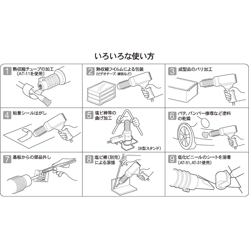 ベストセラー標準タイプの工業用熱風機です。 乾燥・溶解・過熱・熱収縮チューブ、シュリンク包装などの作業。 本体ボディーは鋼板製で、表面はクロームメッキ処理を施してあり、耐久性に優れています。 工業用ドライヤーとしてあらゆる産業の作業現場で使用されています。 ヒーター温度内部分布を安定させる改善を行い、約30%(従来機比較)の耐久性の向上を実現しました。 ●消費電力:100V・1000W。 ●スイッチ:3段切換スイッチ(切・送風・熱風)。 ●温風温度:450度。 ●風量:0.18L/min。 ●風速:1000m/min。 ●サイズ:本体径70×長さ213×高さ191mm。 ●重量:約750g(電源コードを除く)。 ●電源コード有効長:約3m。 ●付属品:R型スタンド・フィルター。