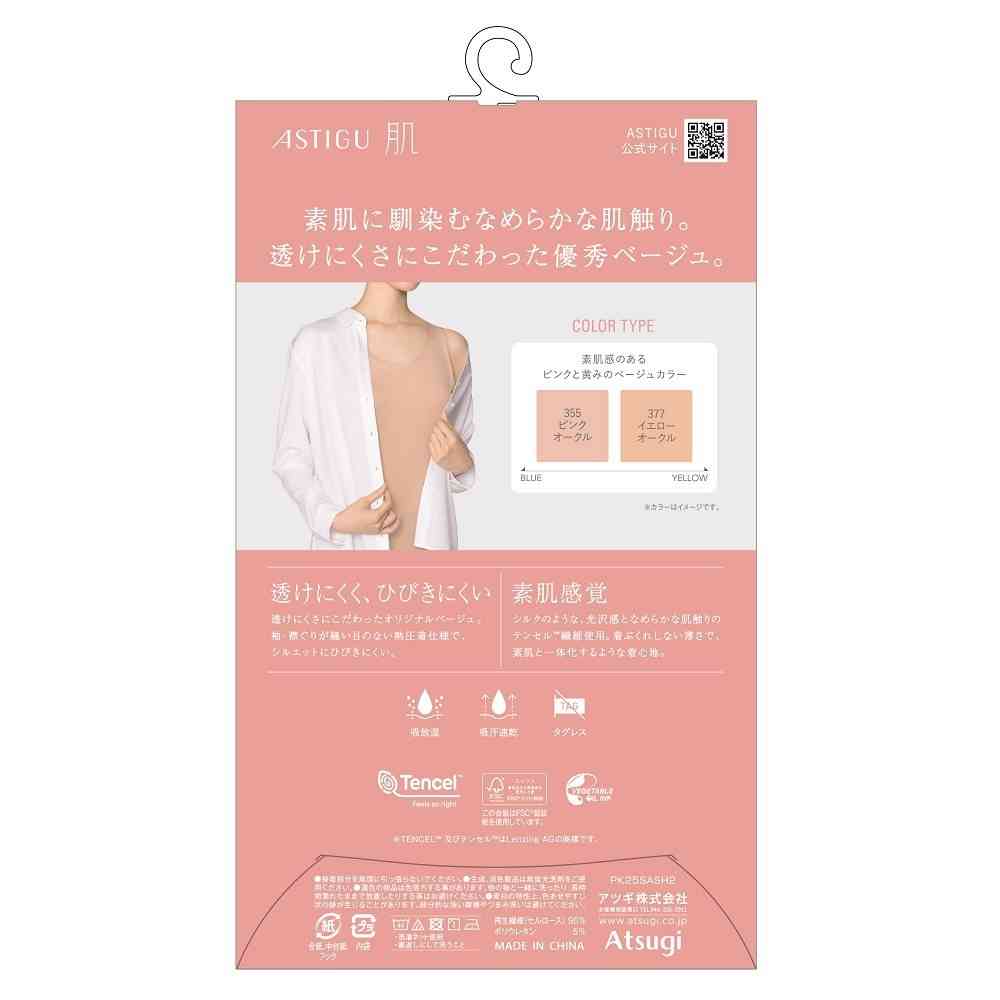 素肌に馴染むなめらかな肌触り。 透けにくさにこだわった優秀ベージュ。 素肌感覚。透けにくく、ひびきにくい。 吸放湿。吸汗速乾。 襟ぐり、袖ぐり縫い目のない熱圧着仕様。 洗濯表示直接プリント。
