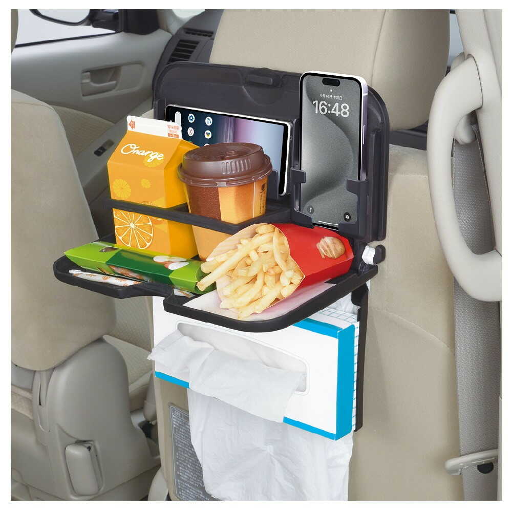 ●スマートフォンを縦置きと横置きでそれぞれ収納できるポケットが付いたリアトレイです。 ●トレイの開閉部分に回転式のチャイルドロックストッパーを採用し、お子さまのいたずらを防止できます。 ●ドリンクホルダーを使用すると500ml紙パックが2個置けます。 ●ビニール袋が掛けられるフックとティシュボックスごと取り付けできるティシュボックスステー付きです。 ※ドリンクホルダーにはストッパー機能がないため完全にはホールドできません。