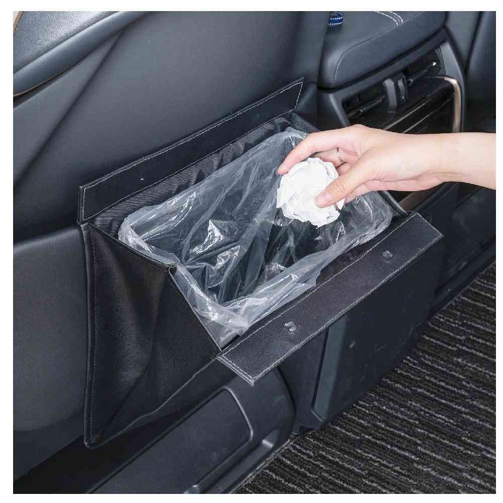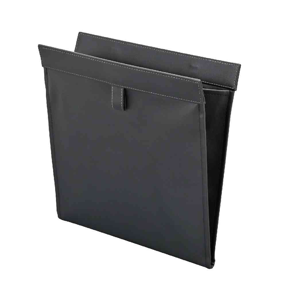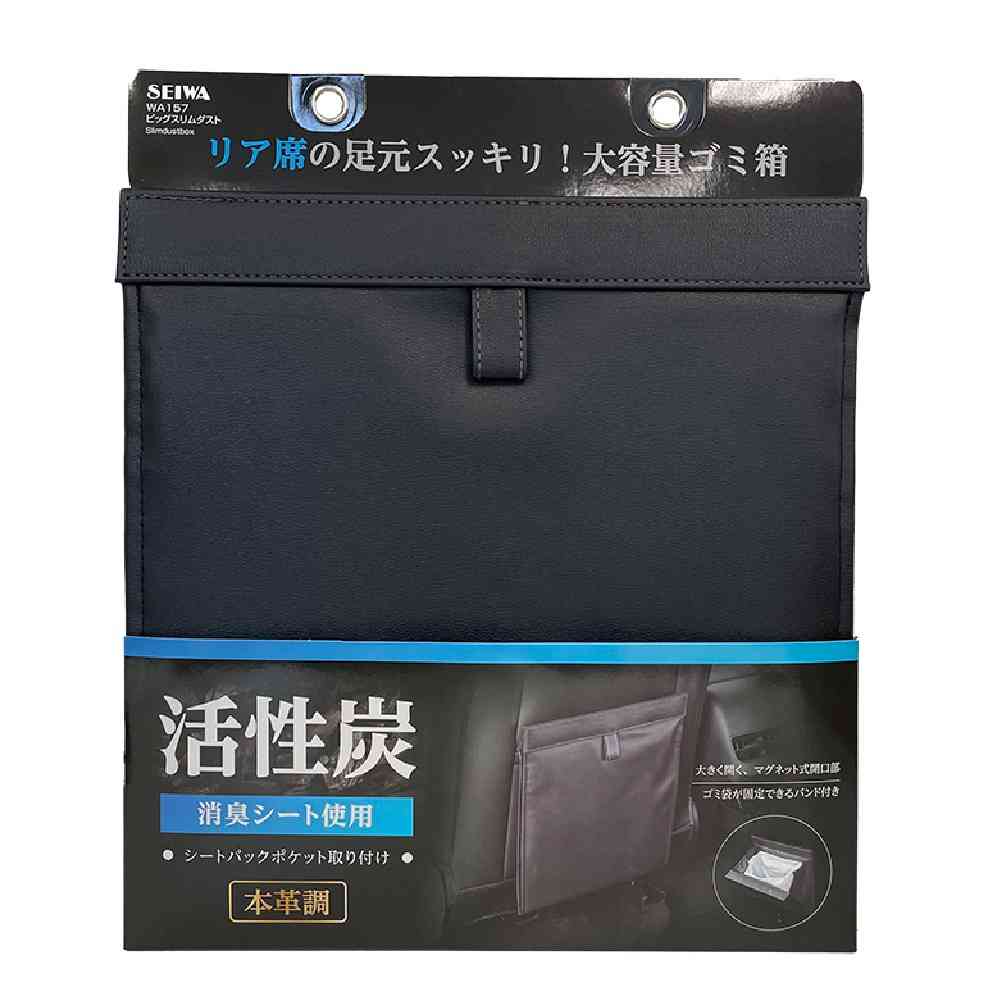 ●スリムな折り畳みタイプのシートバックポケットに取り付けるゴミ箱です。 ●上質で落ち着きのある黒色本革調生地採用。 ●消臭効果のある活性炭」シートを生地内部の芯材に使用しています。 ●本体裏面の固定ベロでシートバックポケットに簡単に取り付けることができます。 ●ゴミ箱の開口部はマグネット式で簡単に開閉ができて便利です。 ●本体内側に便利なゴミ袋固定用バンド付きです。