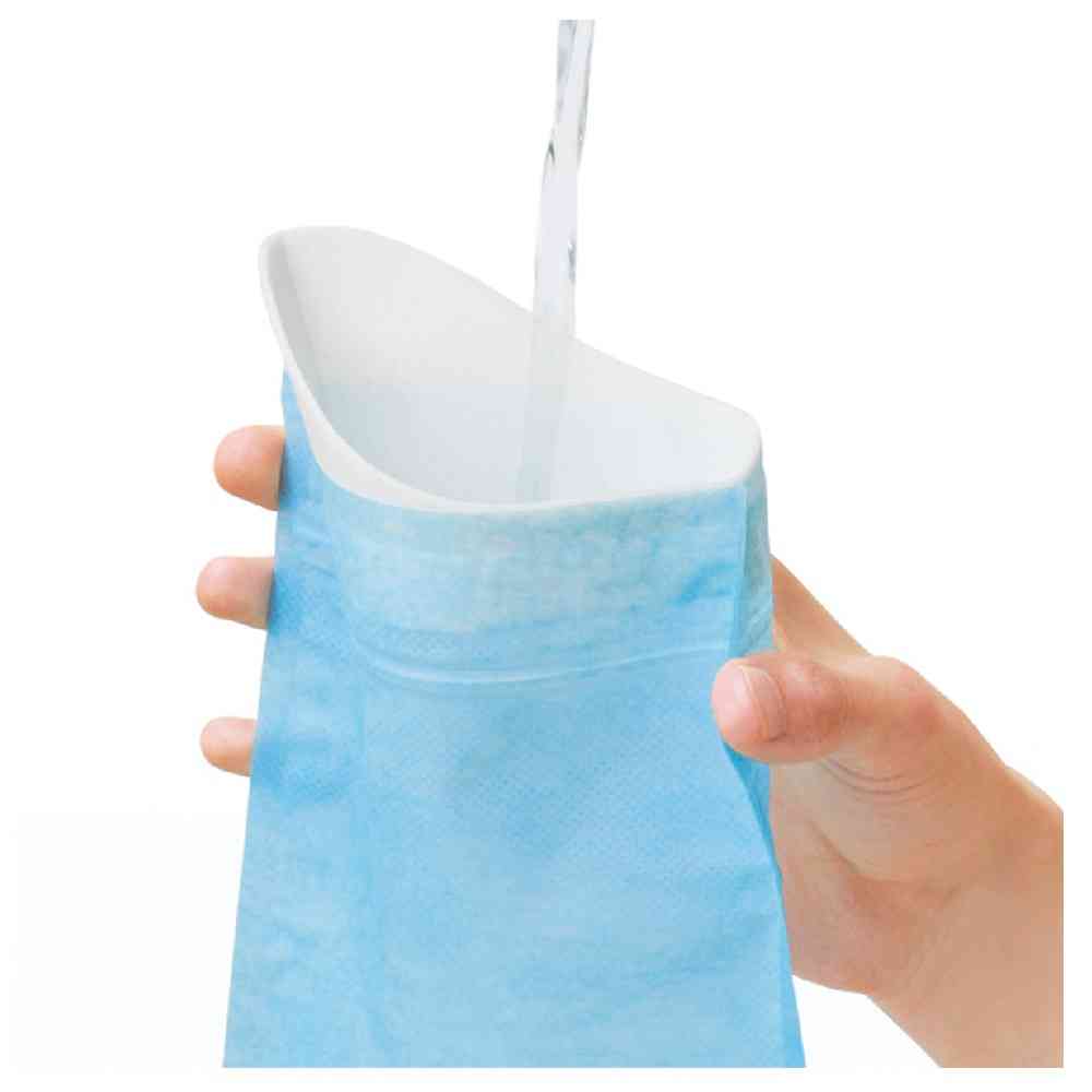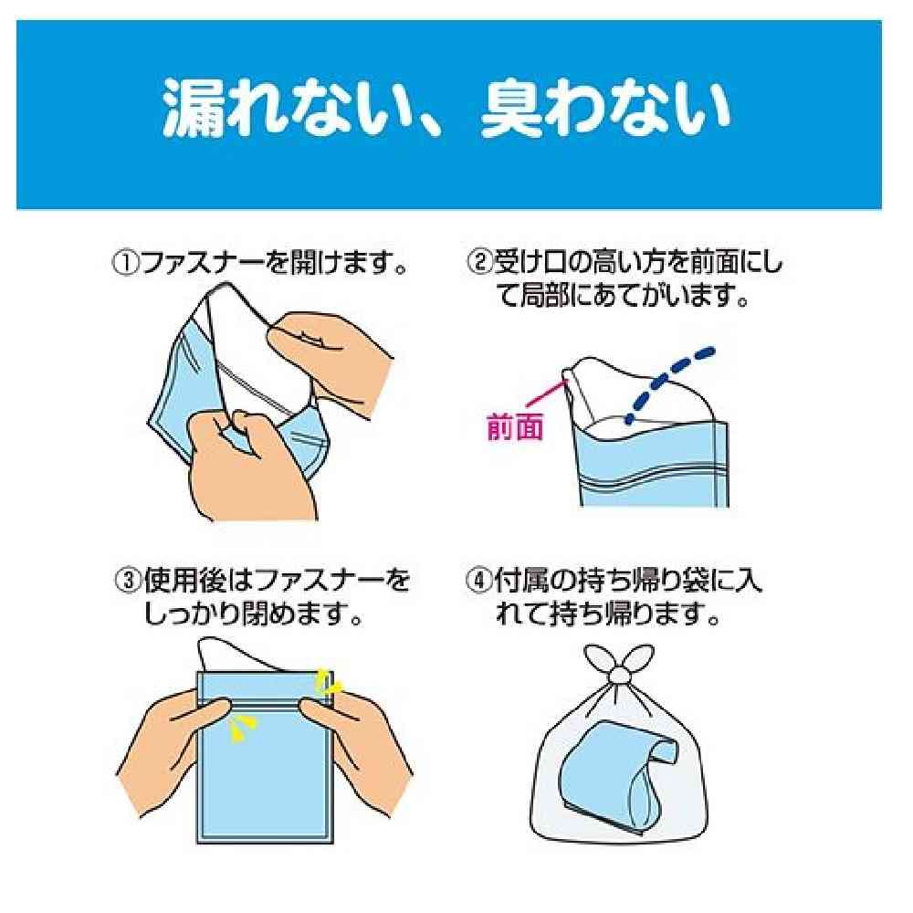 ●尿処理袋が尿を素早く固めニオイを包みます。(尿処理袋2枚入り) ●尿処理袋は不織布とポリエチレンの貼り合わせで肌に優しく強くて安心です。(密封ファスナー付き) ●しっかりした受け口がついているのでお子様や女性でも安心してご使用いただけます。 ●使用後の廃棄に便利な持ち帰り袋を付属しています。(2枚入り)