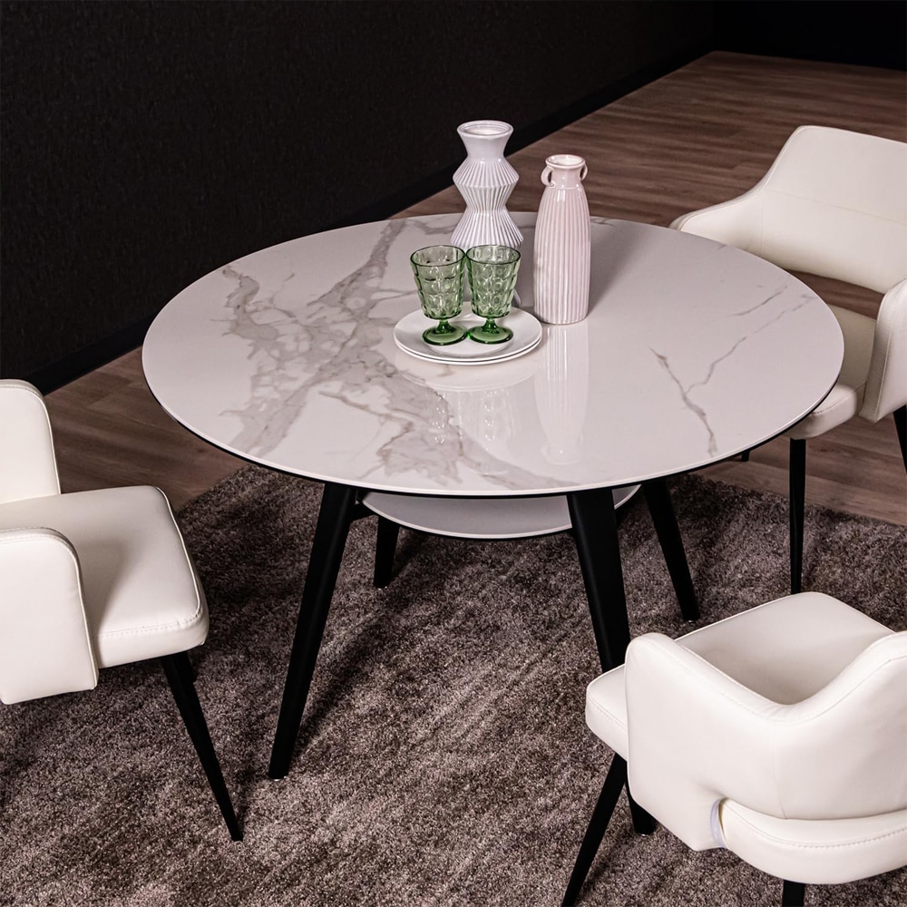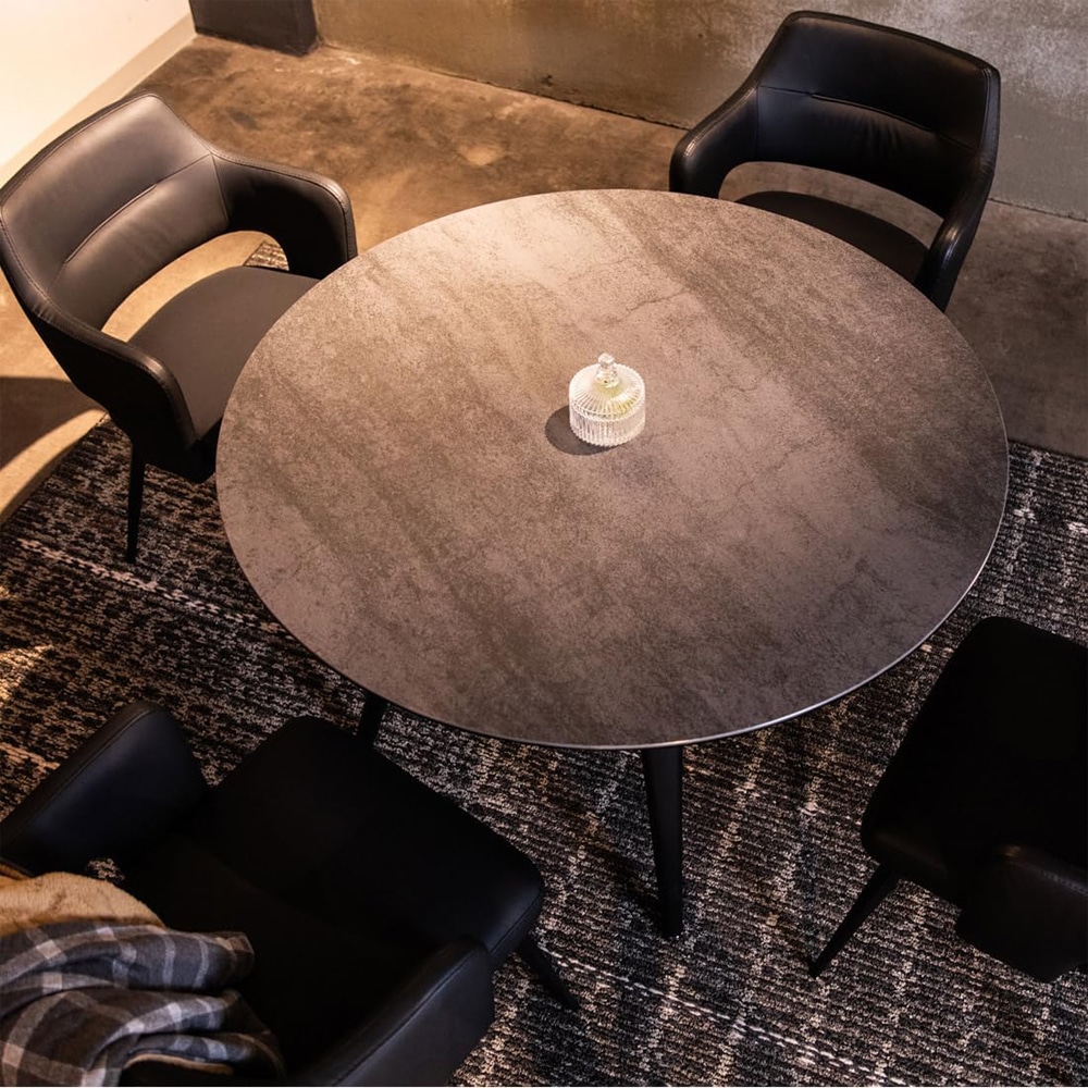 セラミック天板使用のおしゃれなサークル型ダイニングテーブル。セラミック+強化ガラスの高級感あふれるテーブルです。セラミックは、熱・キズ・汚れに強いのが特徴です。焼き物特有の素材感があり、表面の凸凹、質感にあじのあるストームグレイ色、自然な色合い、質感を楽しむことできるホワイトクォーツ色の2カラーよりお選び頂けます。お部屋に映える存在感があり、機能性を両立させた魅力的なテーブルです。