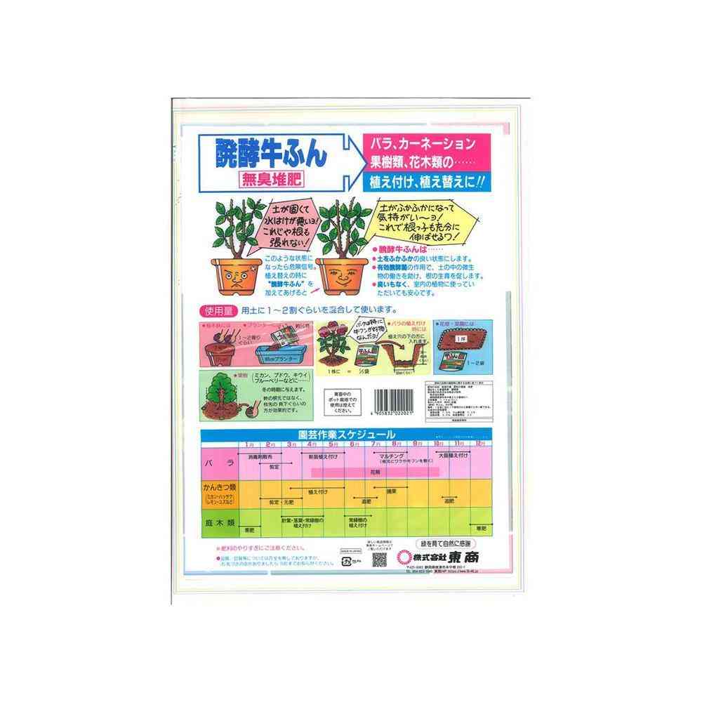 バラや野菜などの土の活性化に最適な無臭乾燥堆肥です。 【特徴】 国内牛ふんを醗酵・乾燥させ、土に混ぜやすく加工してあります。 臭いが抑えられているので花だん、畑の土壌改良に安心・簡単にお使い頂けます。