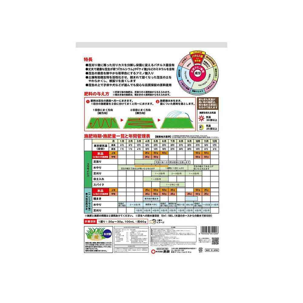 色鮮やかな芝を育て健康維持をサポートする肥料 【特徴】 芝の成育や色を良くする効果の他にカルシウム、ケイ酸等のミネラルが芝を健康にしたり、バチルス菌等の効果で刈りカスを分解し、病気にかかりにくい土壌環境を作るなど、イキイキとした芝生を維持する「芝の医者」のような肥料です。