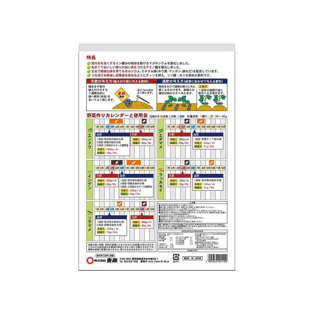 「ぷりっぷり」のまめを育てよう! 【特徴】 アミノ酸と有機原料の働きで、甘くて香りの良い美味しいまめを育てます。 チッソ成分を抑え、つるぼけを軽減する栄養バランスに調整しました。 また、マグネシウムを強化して実付きをよくするリン酸分の吸収を高めてありますので、収穫量アップが期待できます。