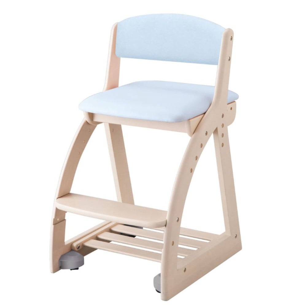 成長に合わせて永く使える木製チェア。 高さと同時に座面奥行が4段階、足置きは2段階に調節できます。