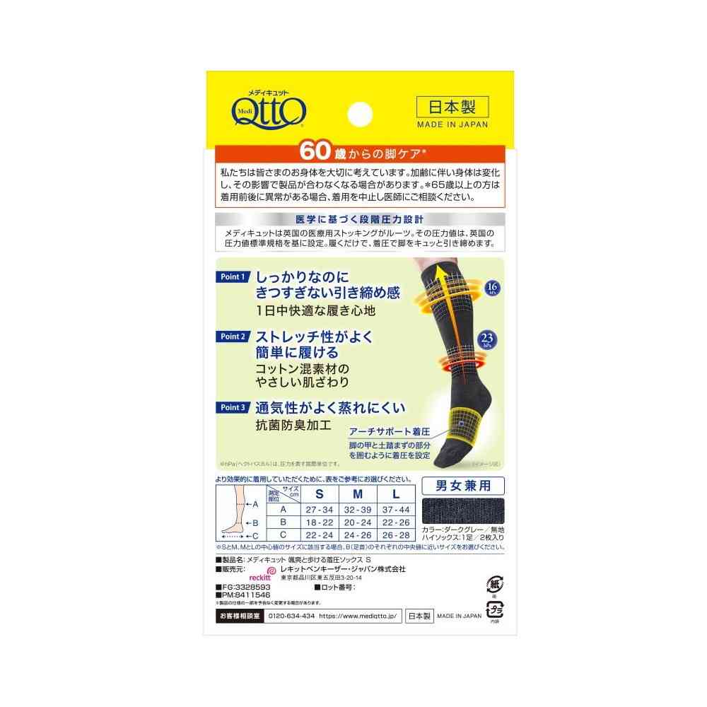 履いて、ふくらはぎの筋肉をサポートし、脚の運びをラクにする。 <製品のポイント> 脚にうれしい3つのポイント ①しっかりなのにきつすぎない引き締め感 ②ストレッチ性がよく簡単に履ける ③通気性がよく蒸れにくい その他特徴: アーチサポート着圧:足の甲と土踏まずの部分を囲むように着圧を設定 抗菌防臭加工 コットン混素材のやさしい肌触り
