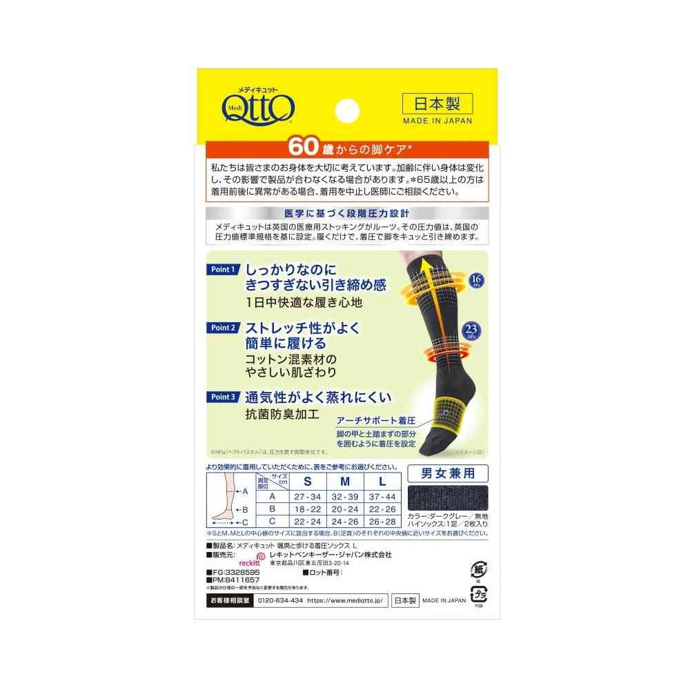 履いて、ふくらはぎの筋肉をサポートし、脚の運びをラクにする。 <製品のポイント> 脚にうれしい3つのポイント ①しっかりなのにきつすぎない引き締め感 ②ストレッチ性がよく簡単に履ける ③通気性がよく蒸れにくい その他特徴: アーチサポート着圧:足の甲と土踏まずの部分を囲むように着圧を設定 抗菌防臭加工 コットン混素材のやさしい肌触り